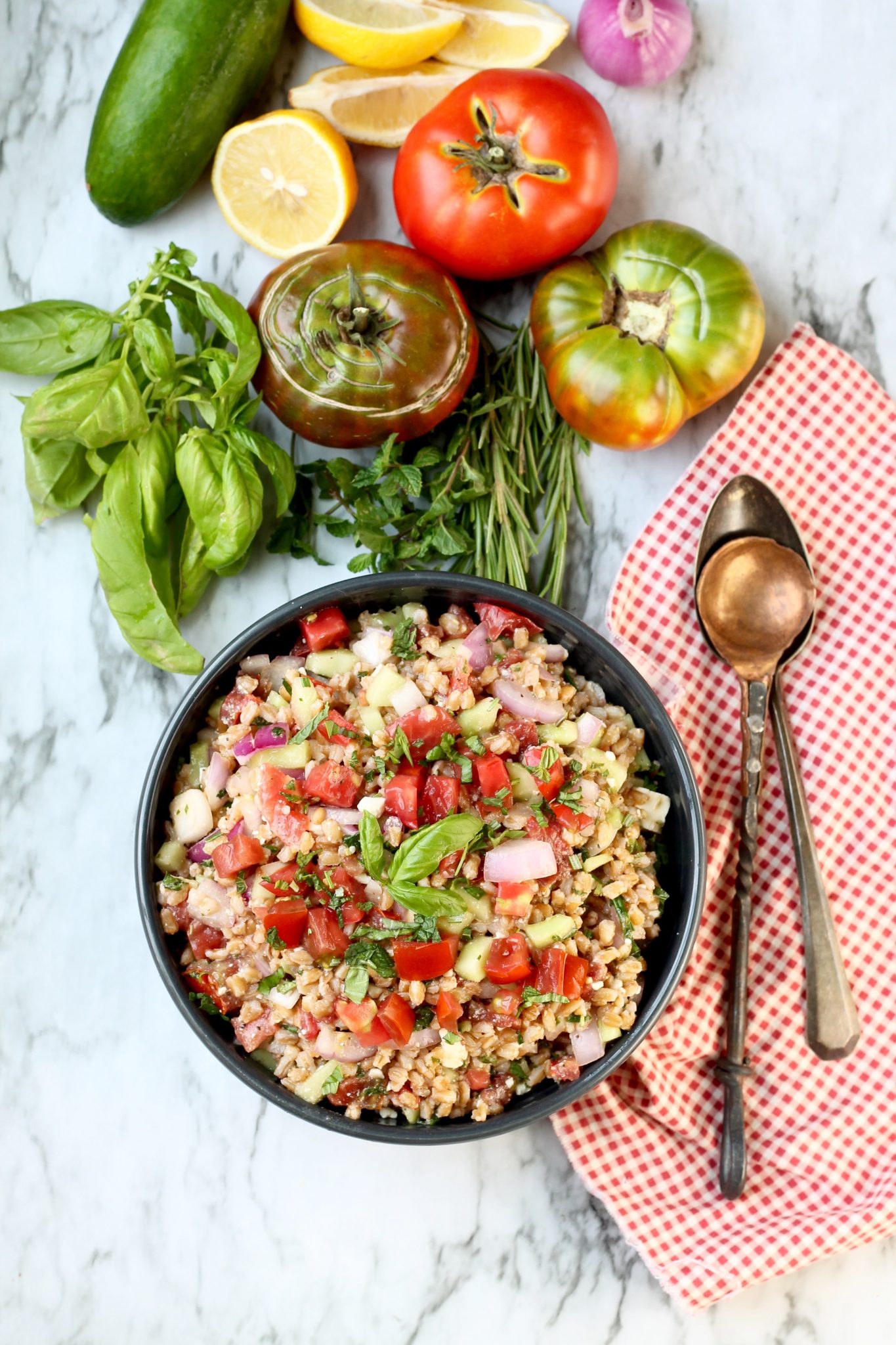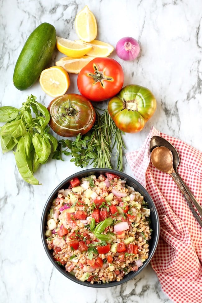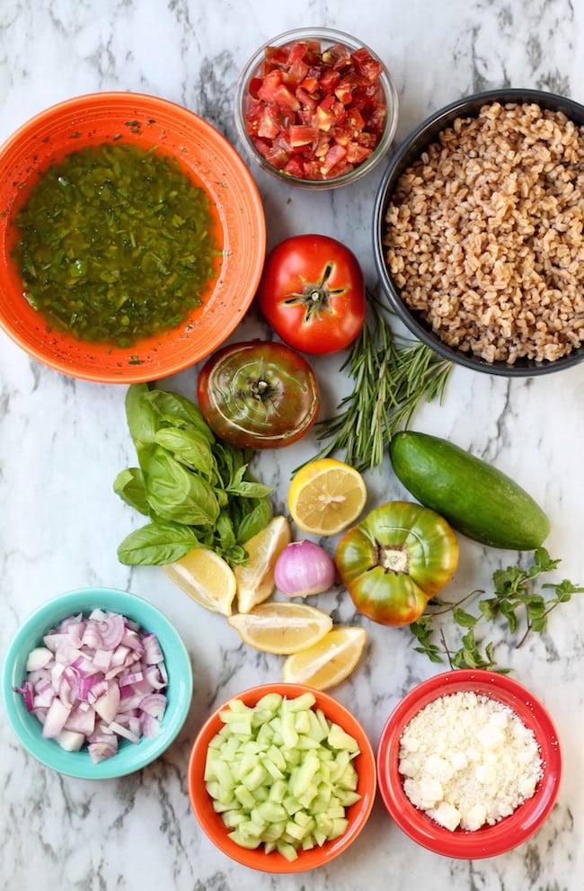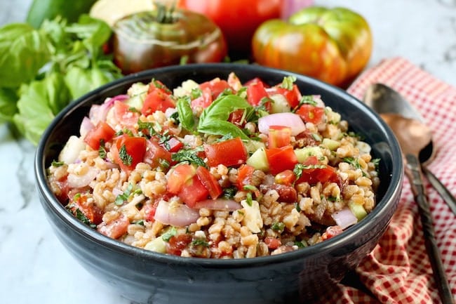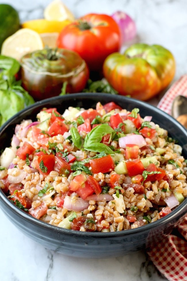 This easy and delicious Greek Farro Salad is a great addition to any meal. It has tons of flavor from a quick lemon and herb vinaigrette, garden fresh tomatoes, cucumbers, red onion, and feta all mixed with farro.