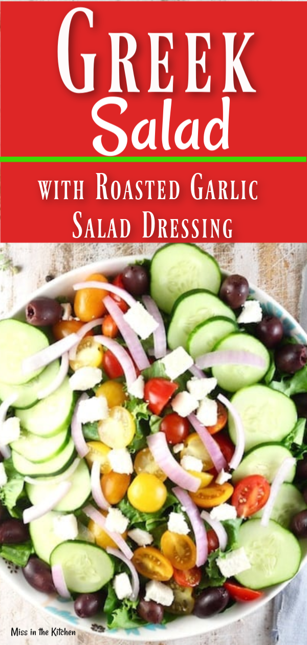 Greek Salad with Roasted Garlic Salad Dressing is a flavor packed salad that can be served as a side or main dish for any night of the week!