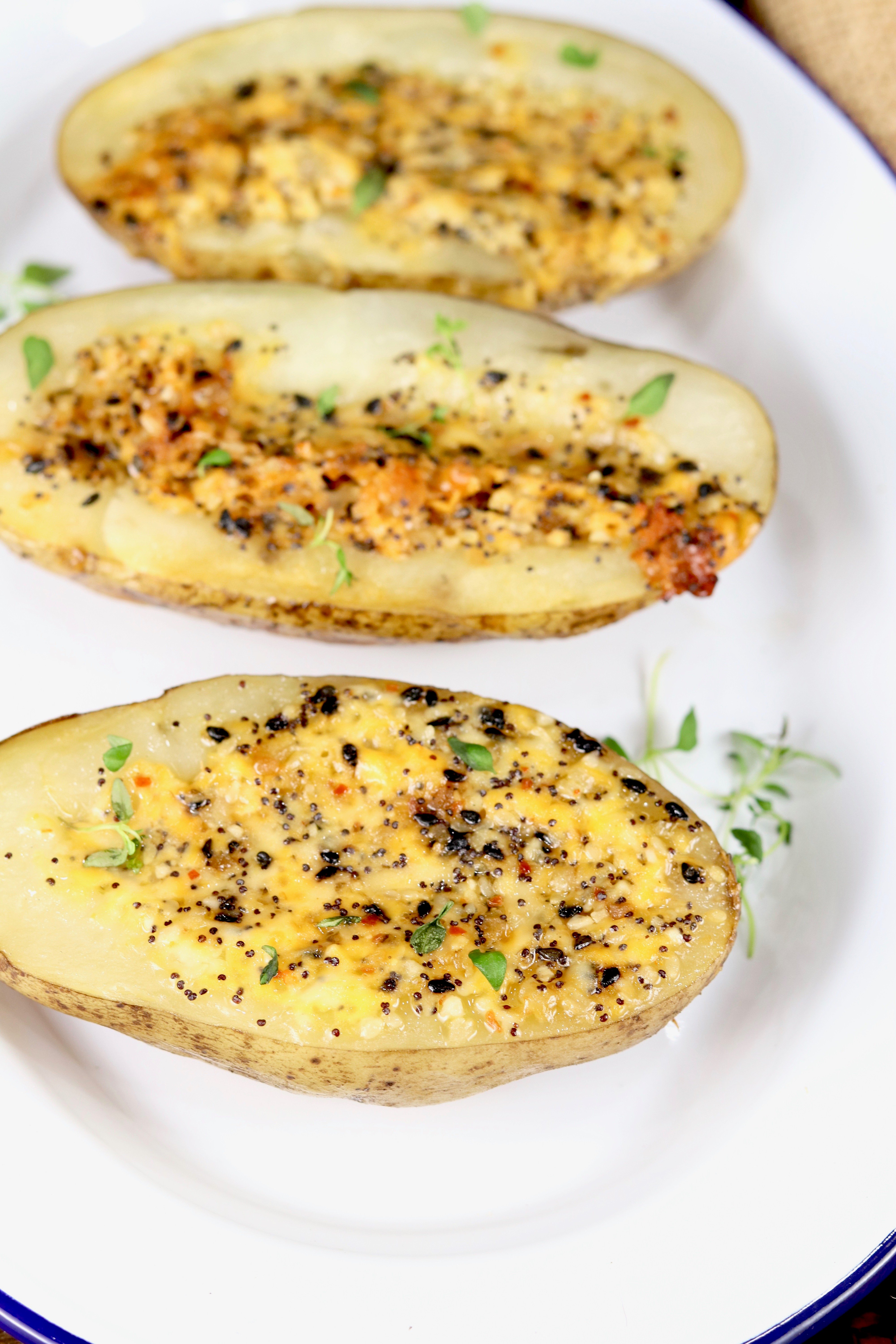 - 1. Scrub potatoes and dry. Cut potatoes and half and scoop out about 1/4 inch wedge from center. Discard or boil and save for another use.