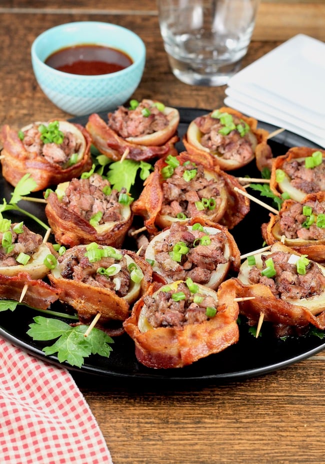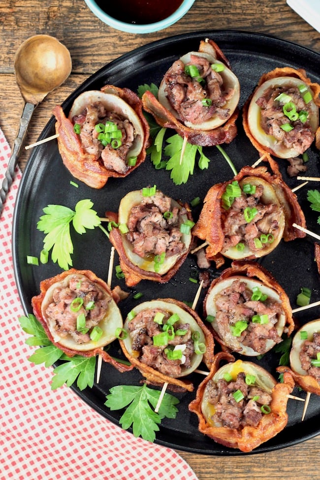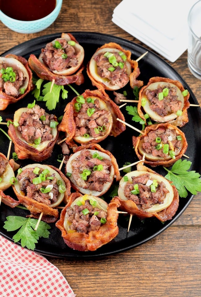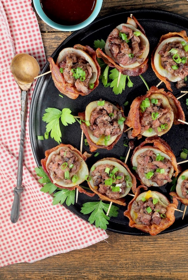 Loaded Potato Skins are a delicious appetizer for any holiday party or game day get together. These Loaded Potato Skins are stuffed with cheese, smoked beef & topped with green onions and then wrapped in crispy bacon!