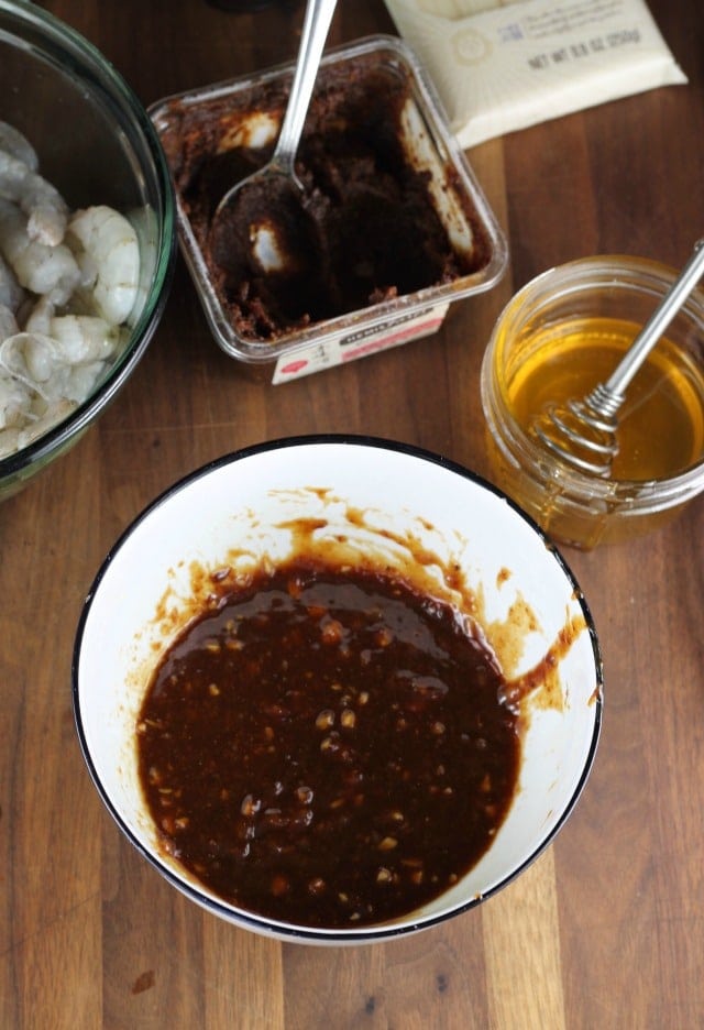 - Add melted butter, honey, HemisFares Red Miso Paste and garlic to a bowl and mix until well combined. Add shrimp and toss to coat. Cover and allow to marinate 10 minutes.