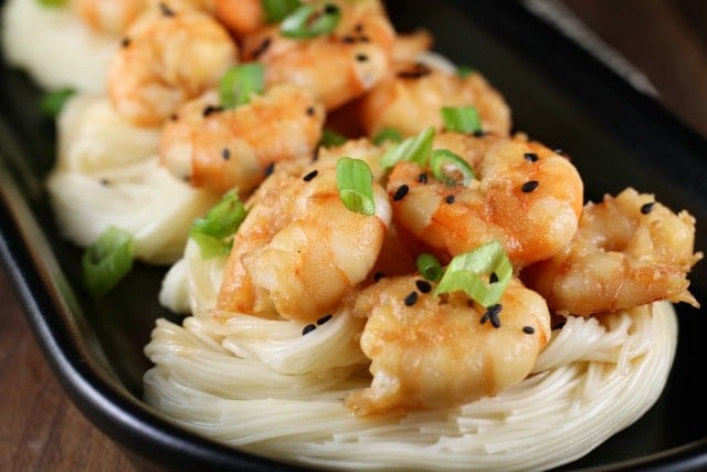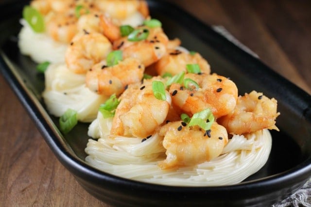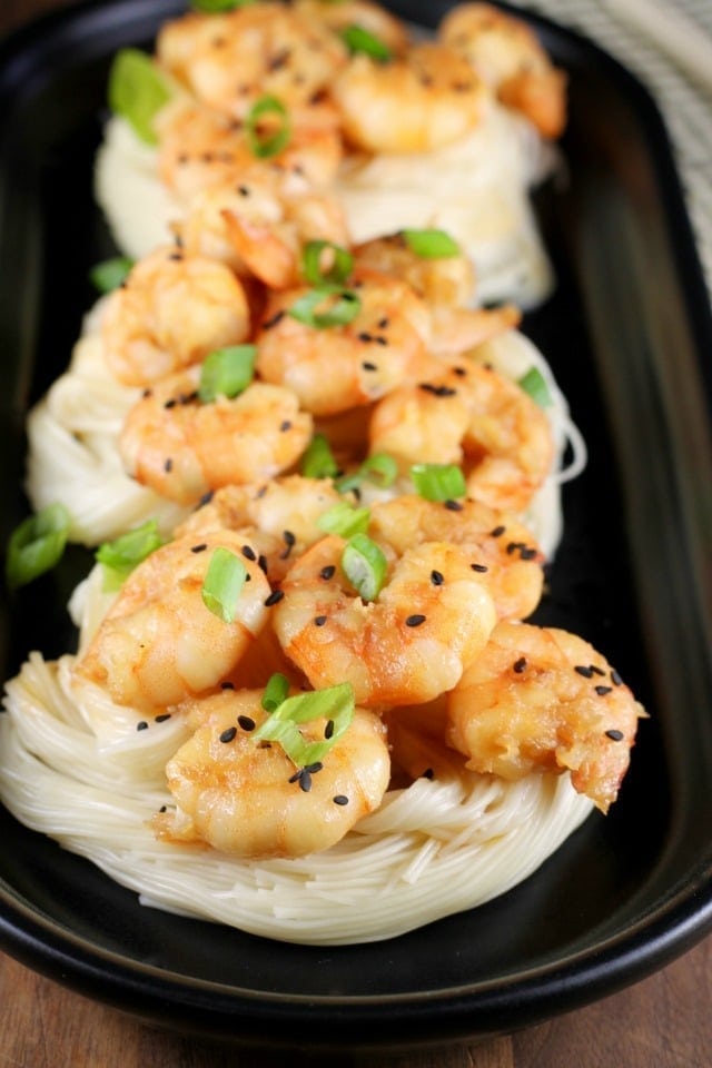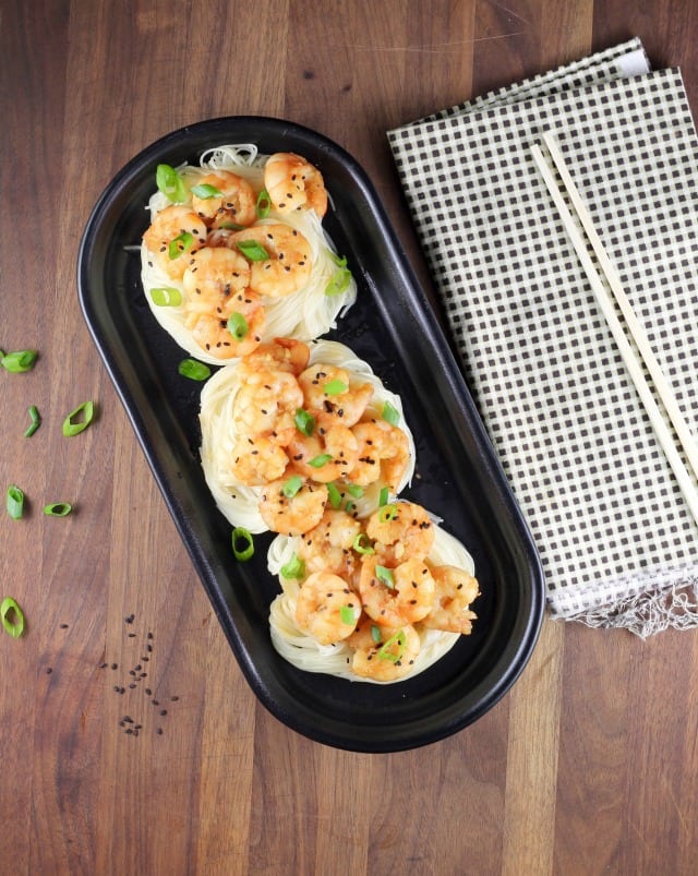 I added the noodles to the serving tray and topped with the shrimp and garnished with black sesame seeds and green onions. It turned out to be a gorgeous dinner and better yet, the whole family loved it!