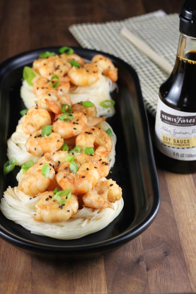 - Serve shrimp over Miwa Somen with additional HemisFares Soy Sauce.