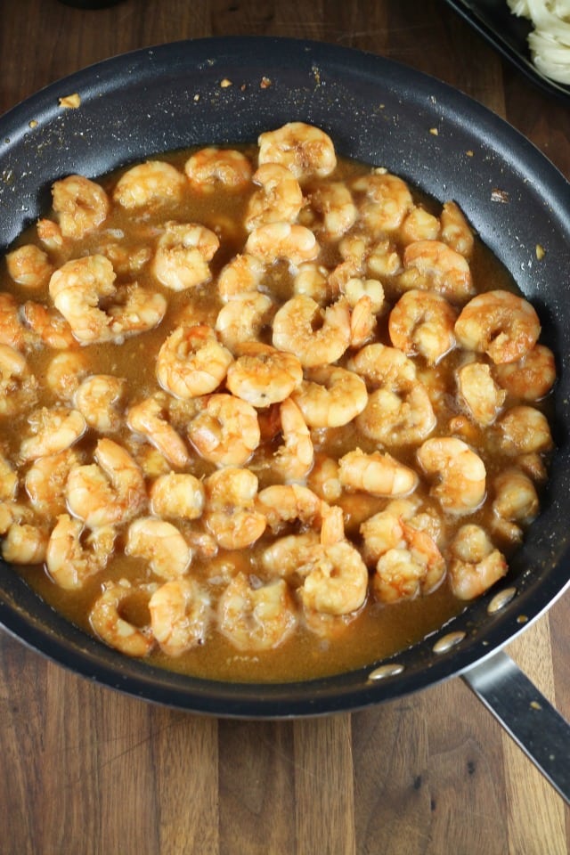 - Heat a large skillet over high heat. Add shrimp and all of marinade. Cook, stirring continuously until shrimp just starts to turn pink. Add Sherry or Mirin and continue to cook, stirring constantly until cooked through about 2 minutes.
