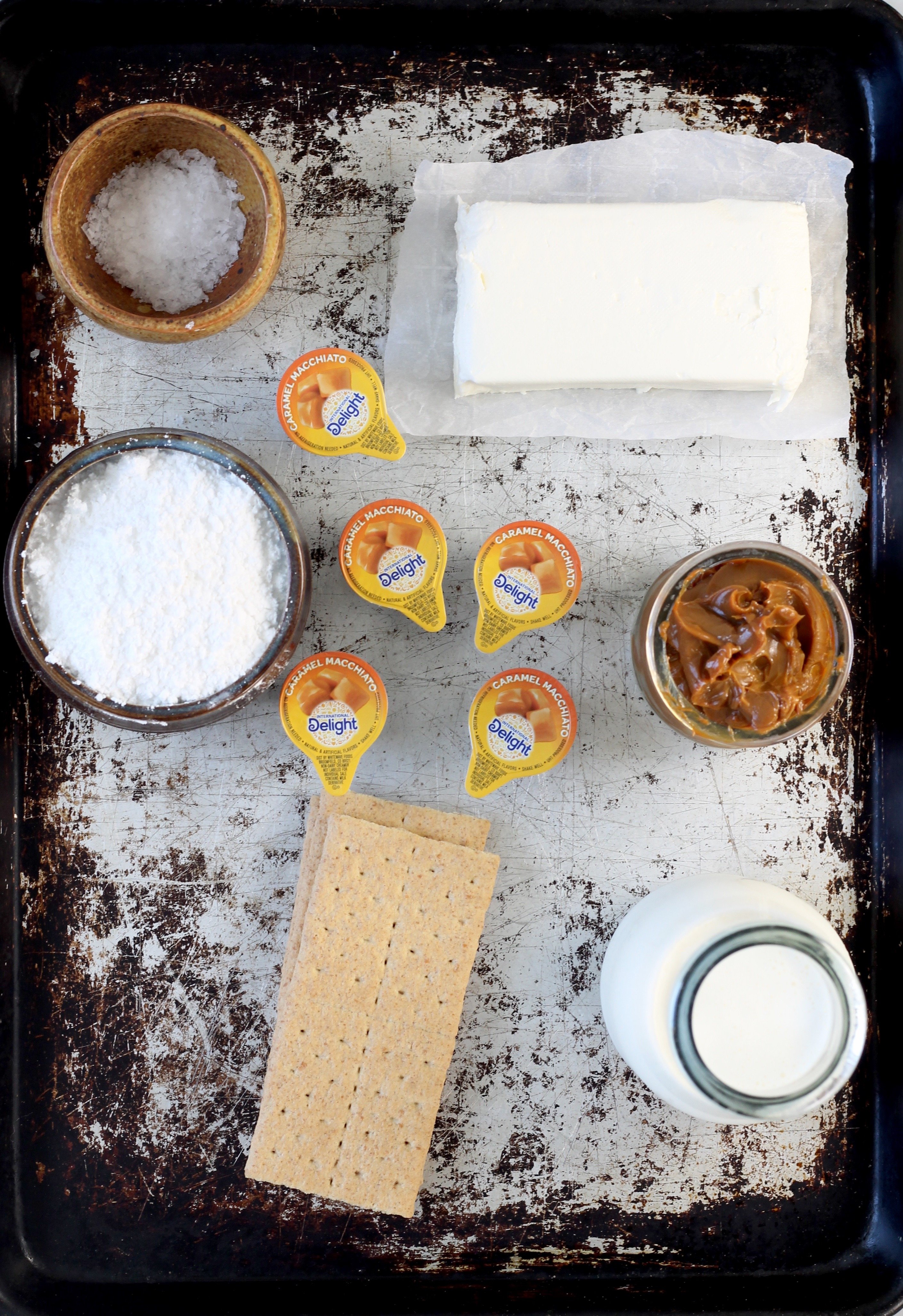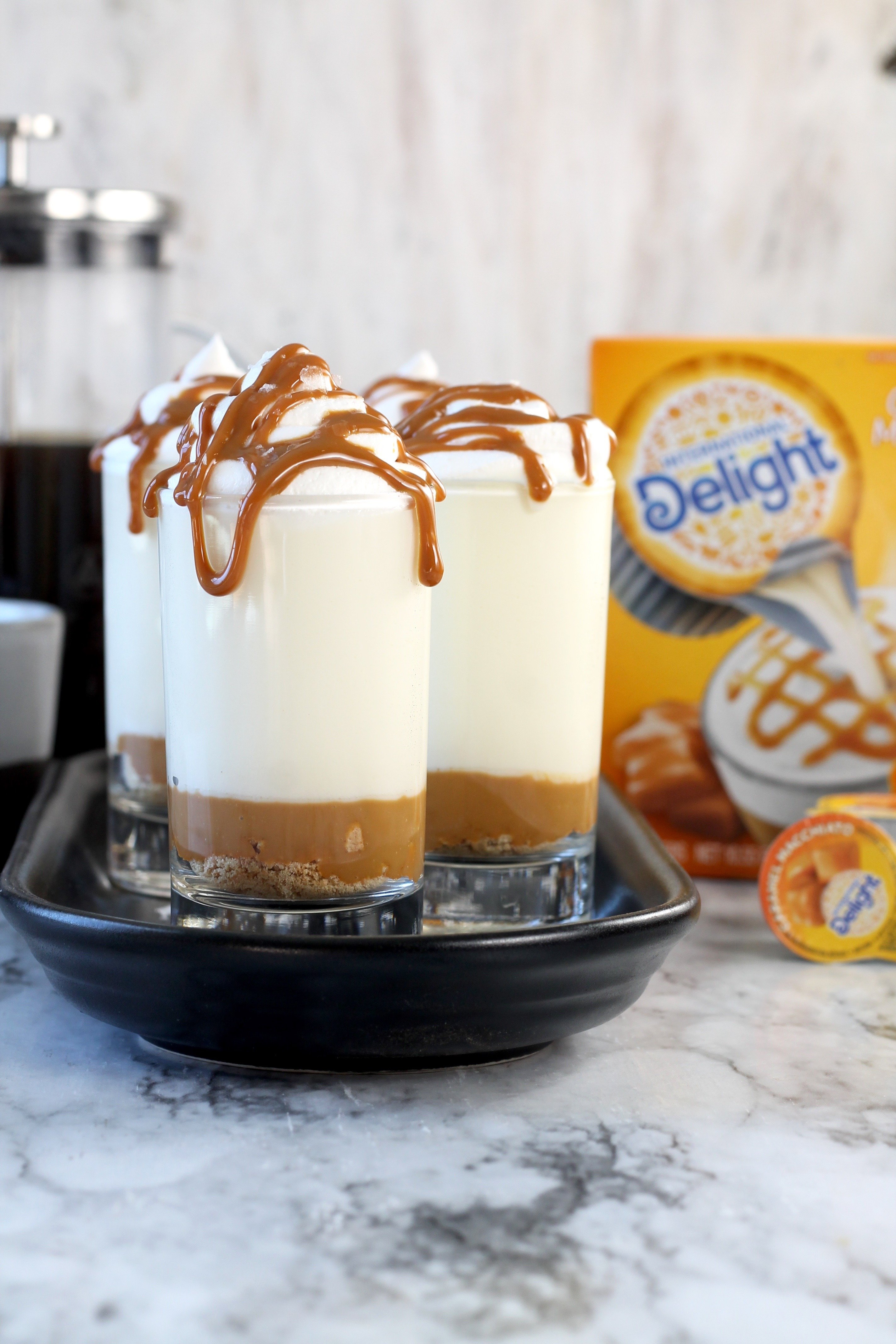 International Delight Creamers are dairy free and great to keep on hand. I am totally in love with the Caramel Macchiato International Delight Creamer. It the special ingredient that adds the delicious caramel flavor to these easy cheesecake desserts!