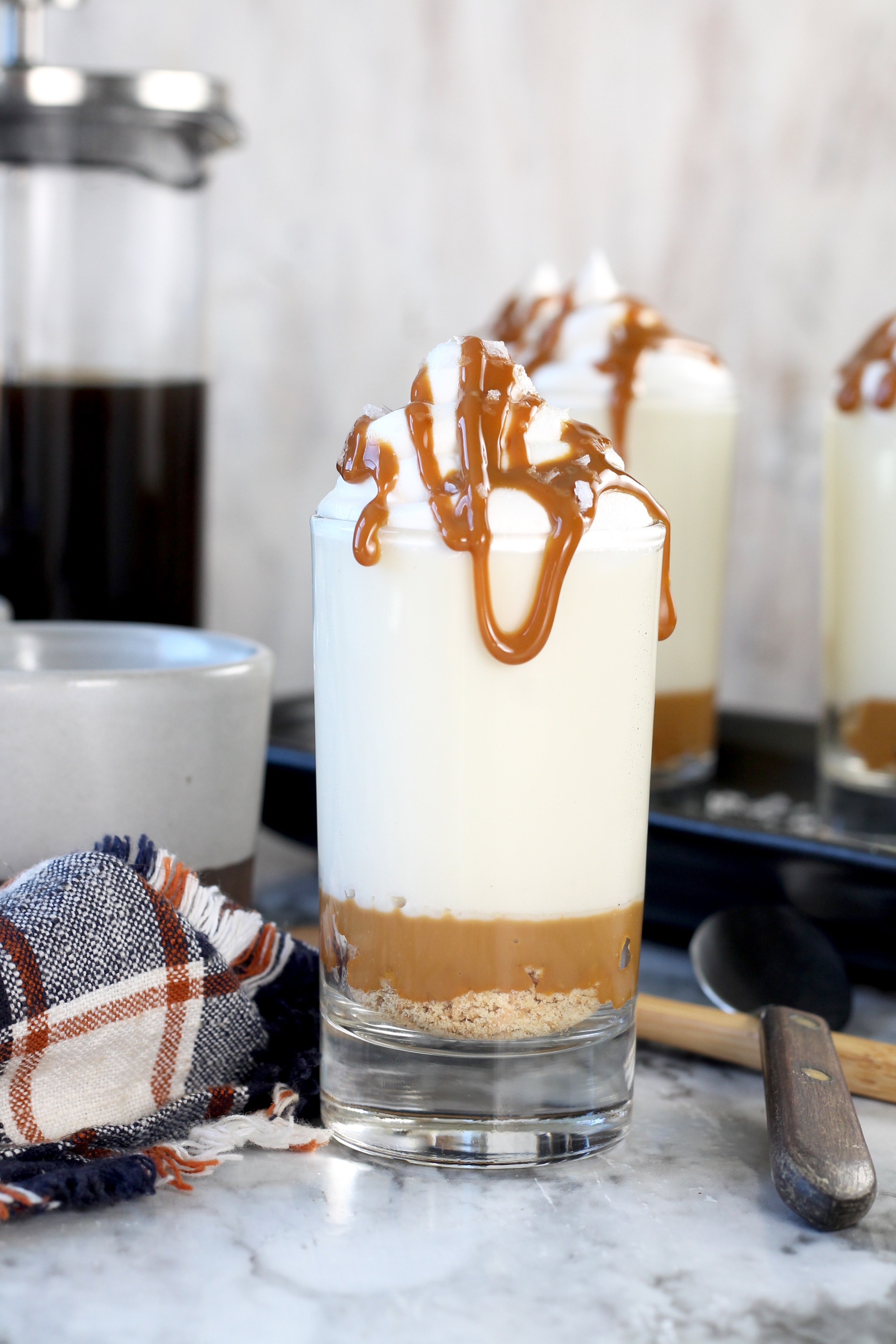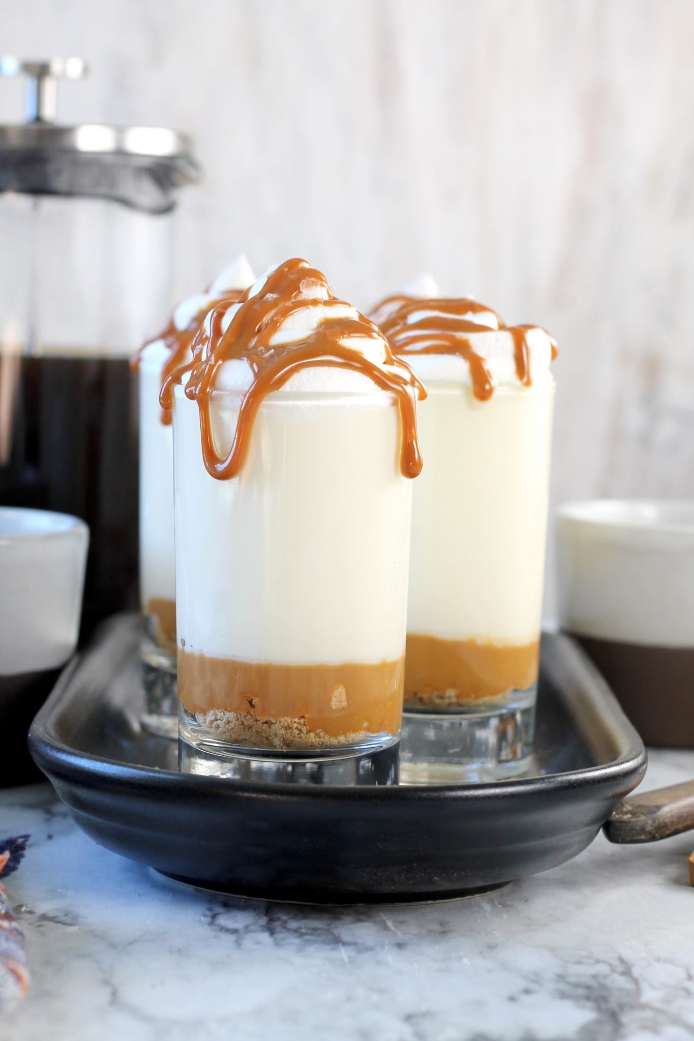 Get the full printable No-Bake Caramel Macchiato Cheesecakes recipe by scrolling to the bottom of this post.