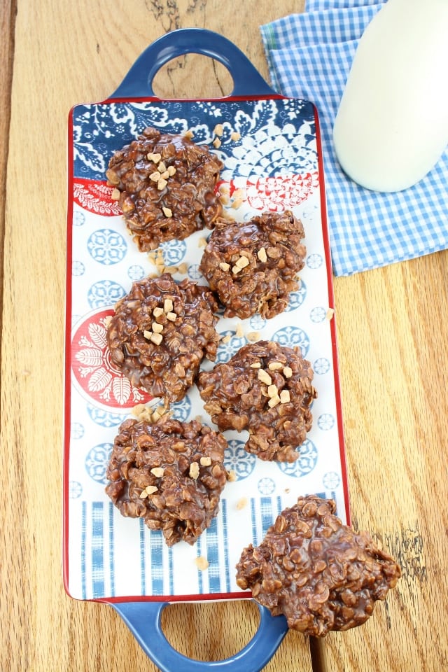No-Bake Cookies are one of my favorites when I’m craving something sweet but don’t have a lot of time for baking. I whipped these up after dinner one evening and had the idea to throw in some toffee bits. Toffee and chocolate are such a great combination and the guys loved these cookies.