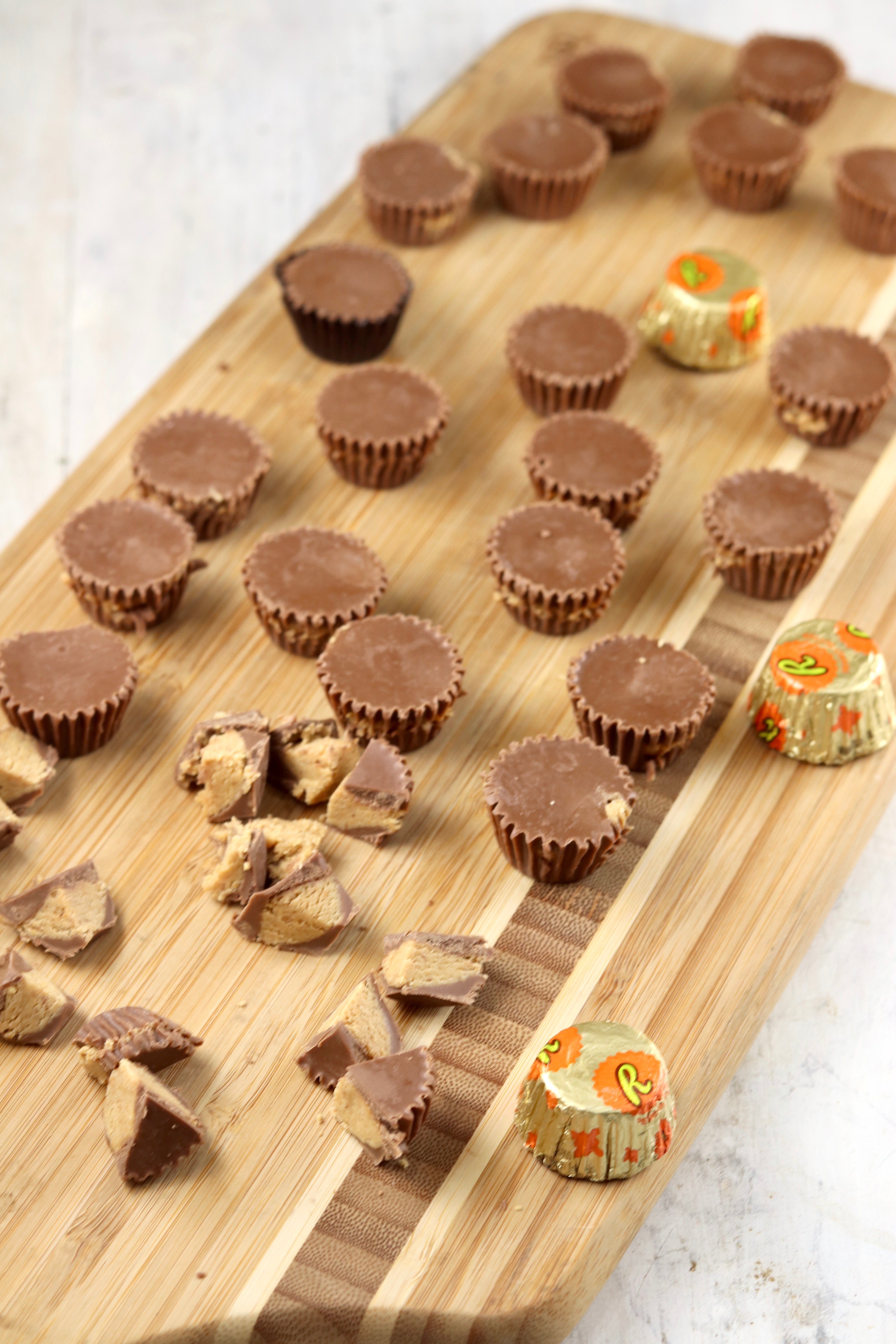 - Chop mini Reese’s Peanut Butter Cups into fourths.