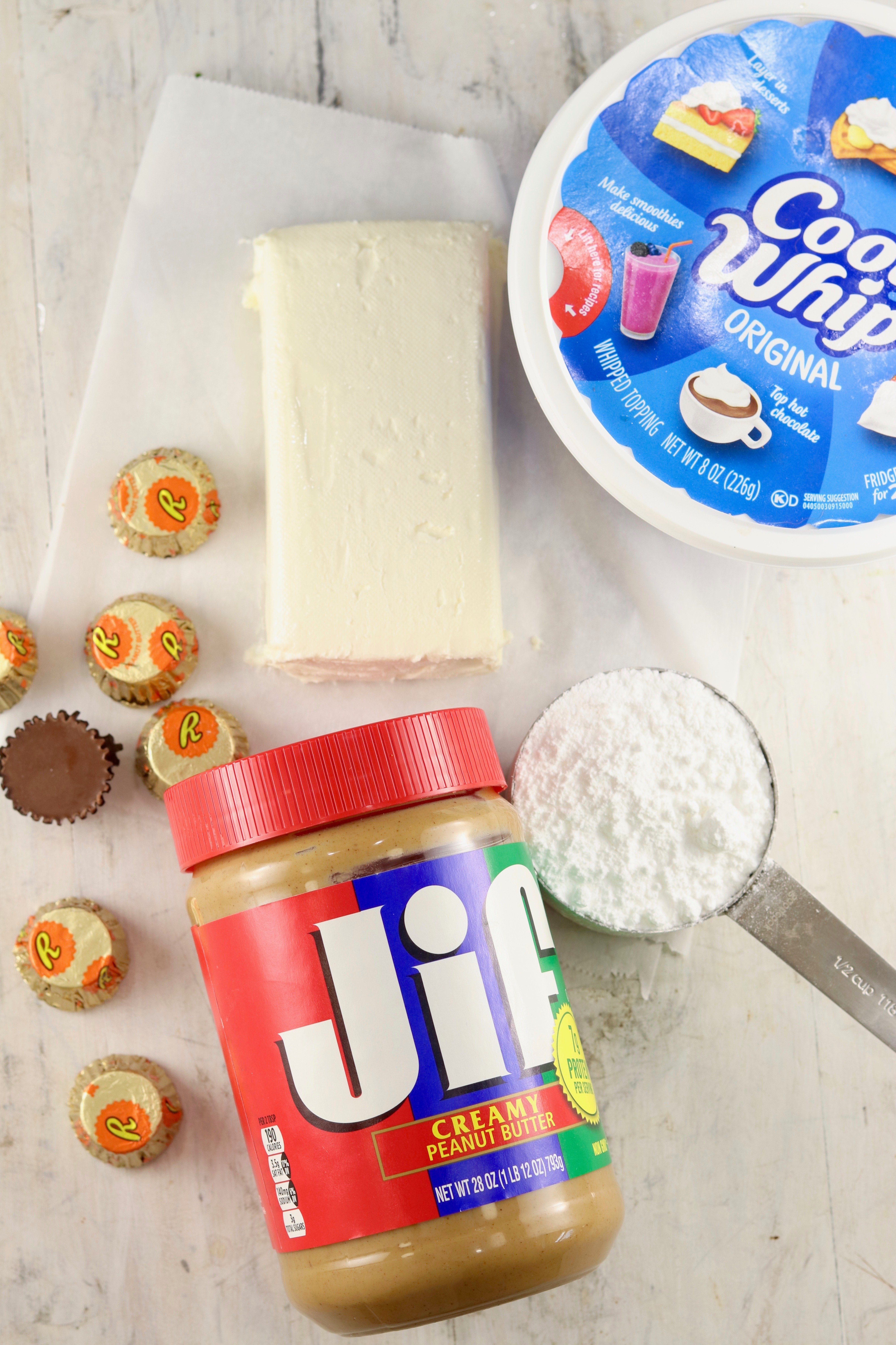 - Add softened cream cheese, peanut butter and powdered sugar to a mixing bowl and beat until creamy. Add cool whip and beat until well blended.