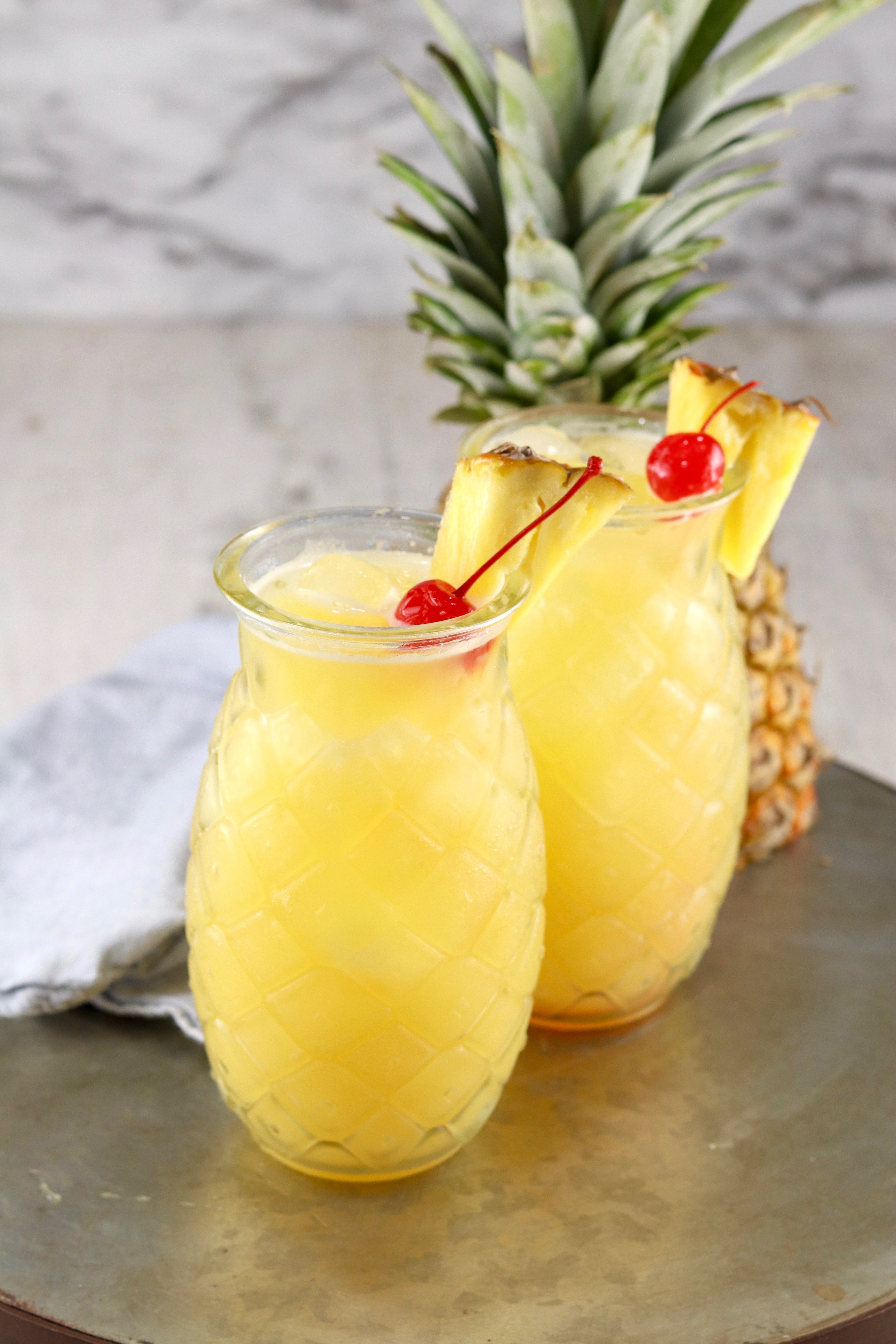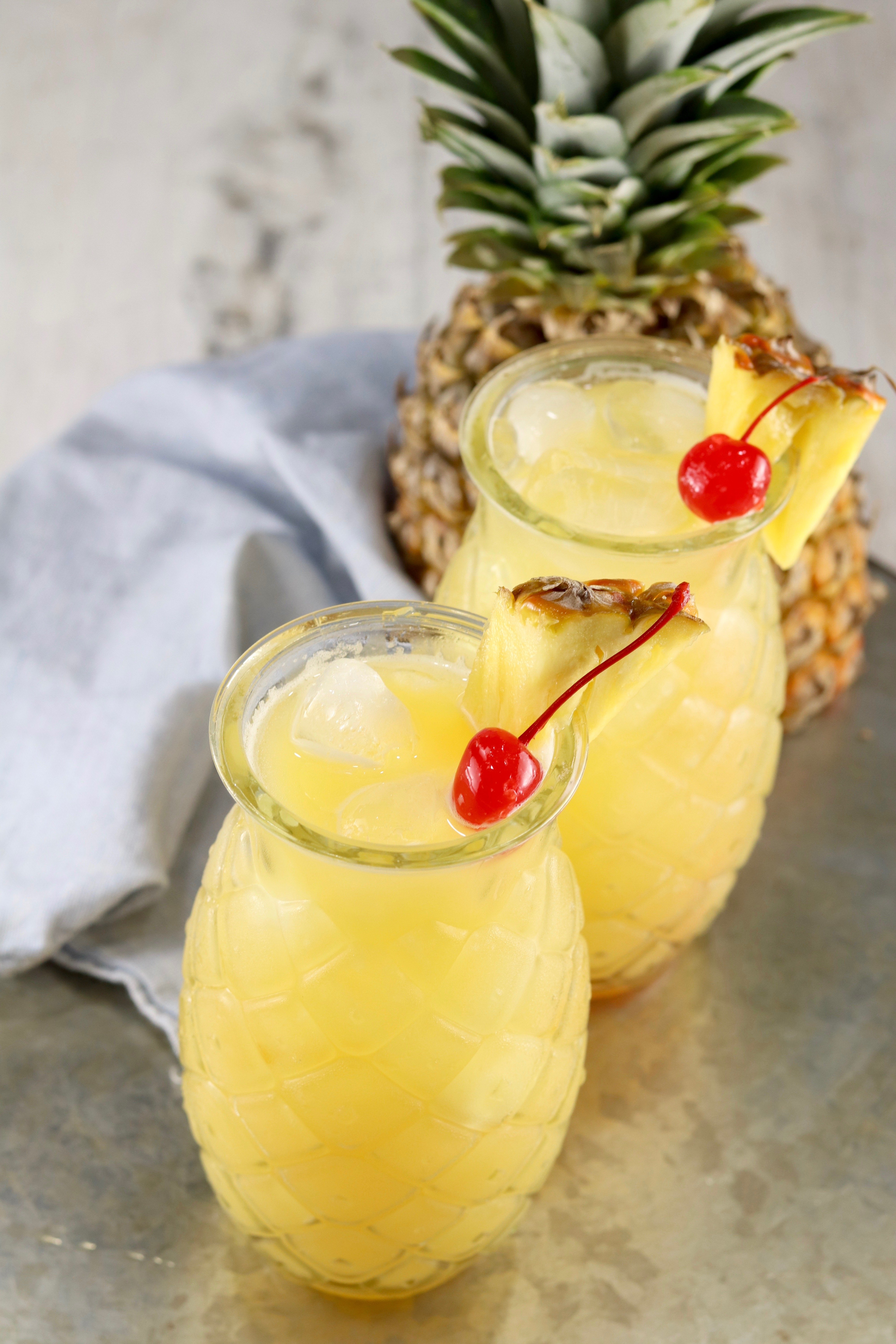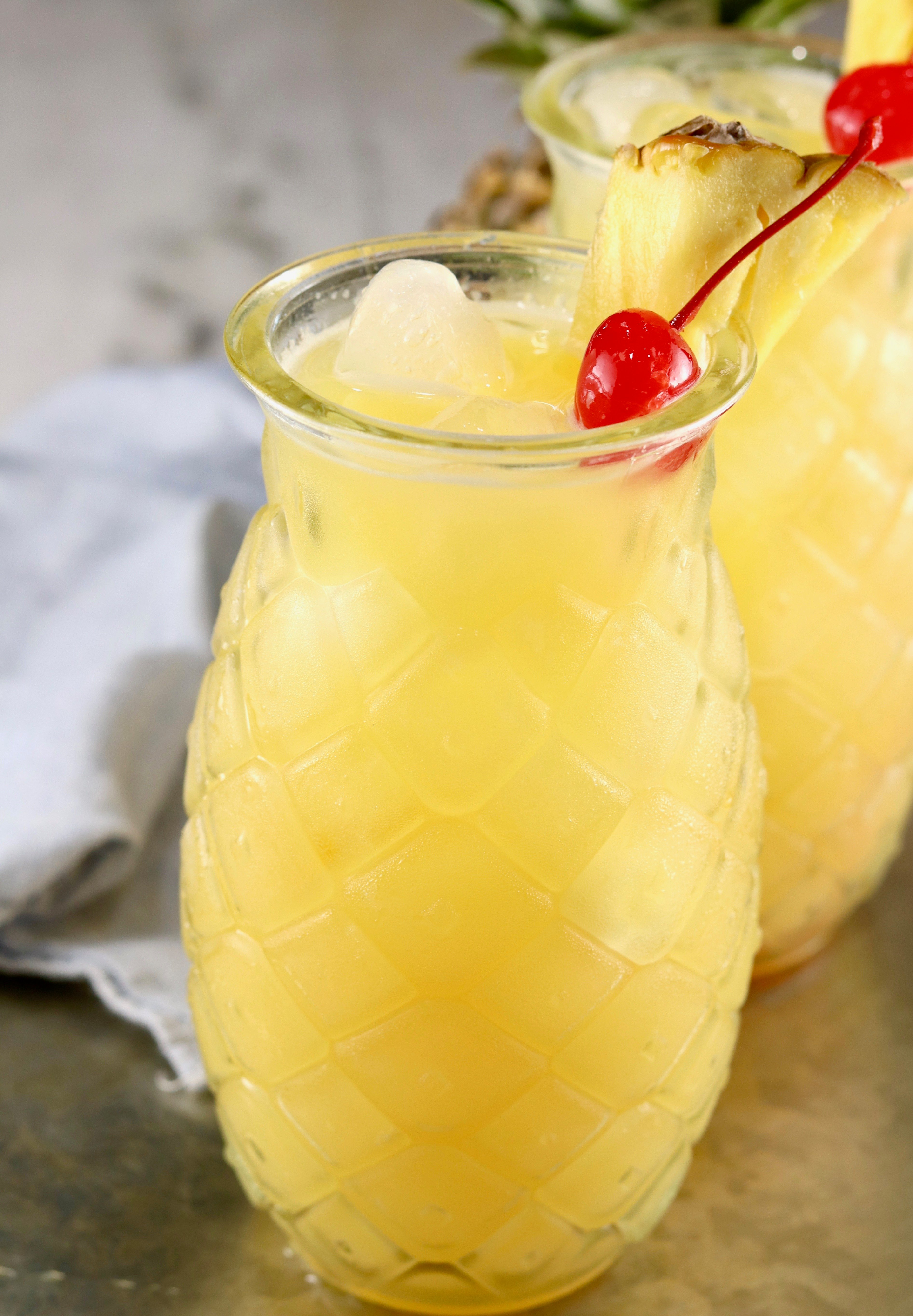 - Garnish with a fresh pineapple wedge and a maraschino cherry if desired.
