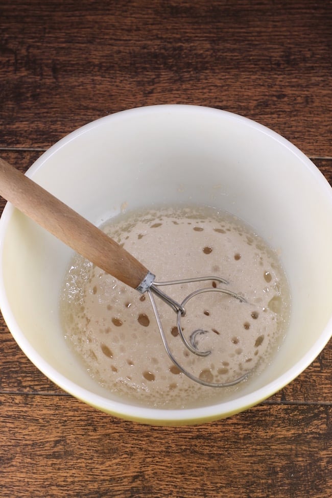 - Add warm water, sugar. yeast and oil to a large bowl and mix together.