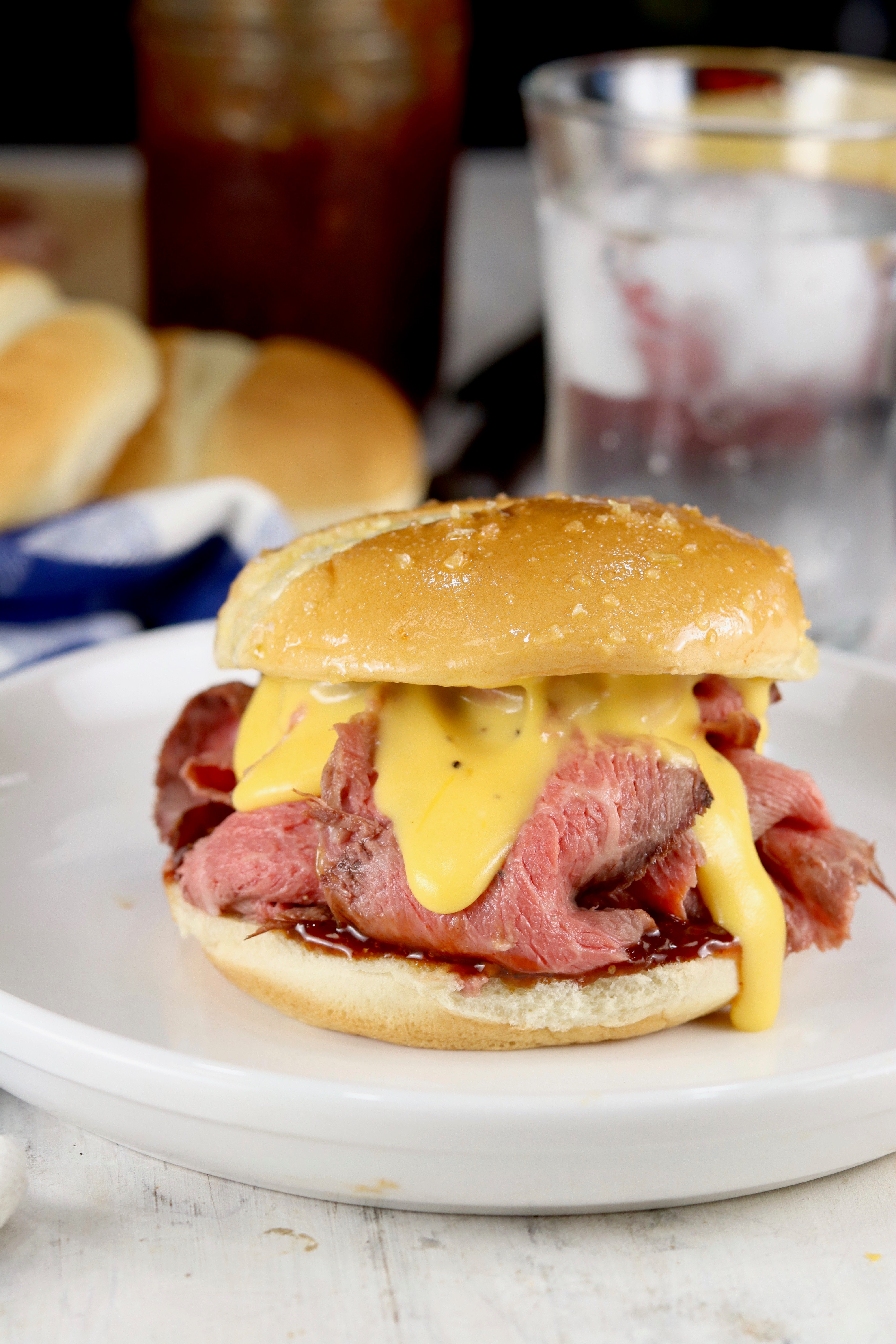A Roast Beef and Cheddar Sandwich is a take out favorite and so simple to make at home. Smoked roast beef is thinly sliced and piled high on a buttery bun with homemade cheddar sauce and barbecue sauce. A delicious flavor combination for lunch or dinner.
