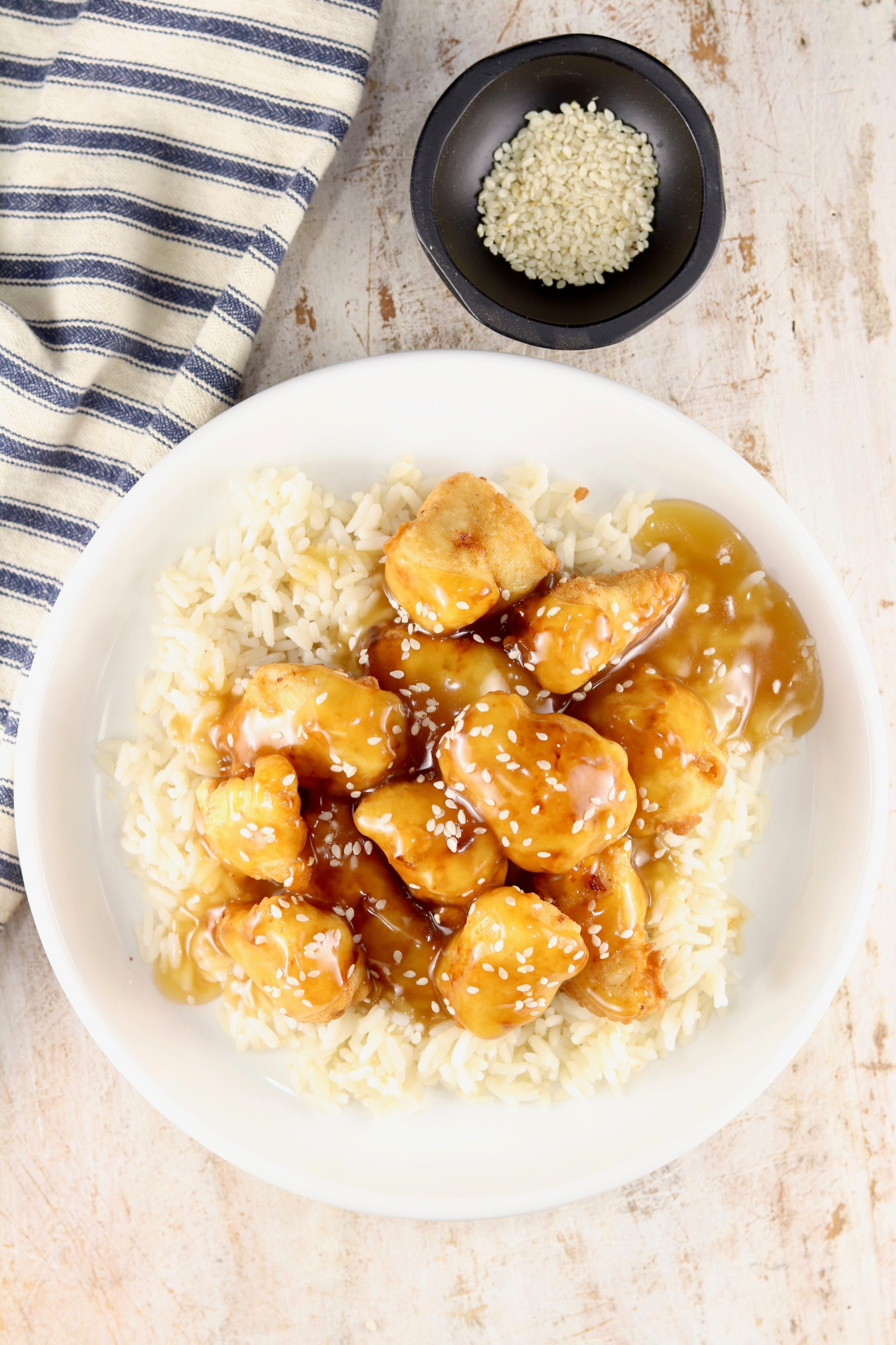 - Serve chicken over rice and top with sauce and sesame seeds.