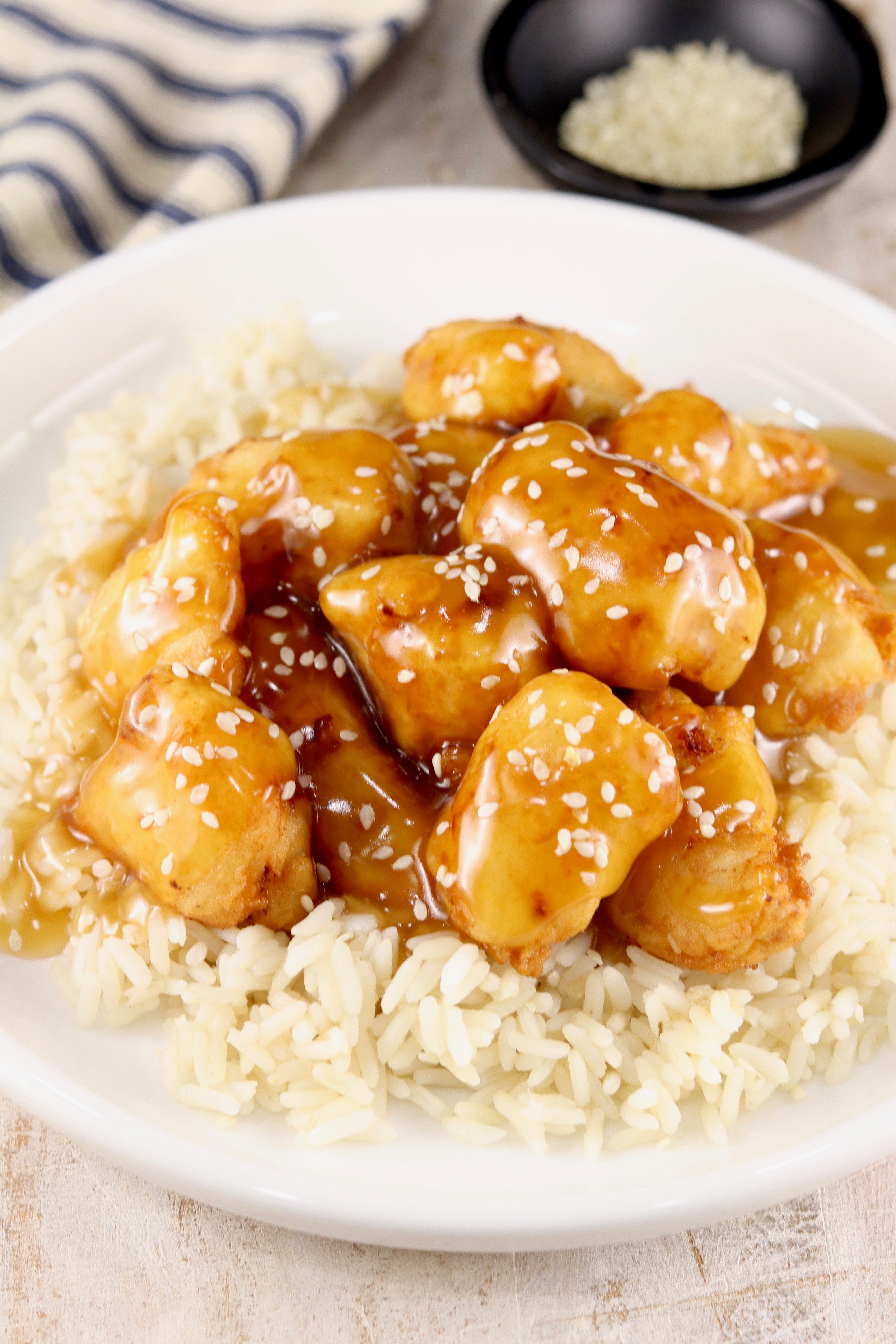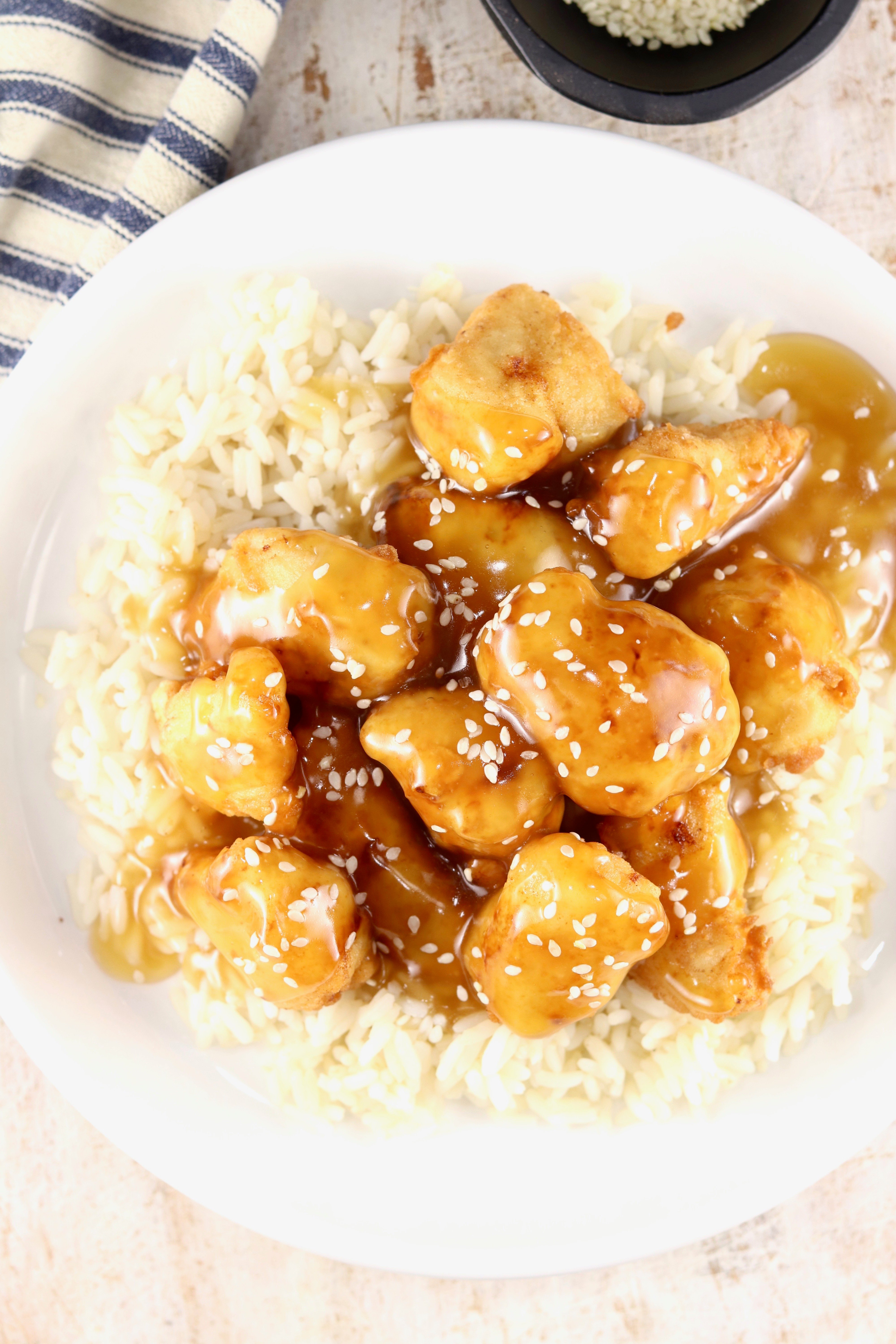 I like to just use the same method for frying the chicken as I do with my Fried Chicken Strips or Easy Popcorn Chicken. You can also use a tempura batter for the chicken or buy breaded frozen chicken to make this even easier.