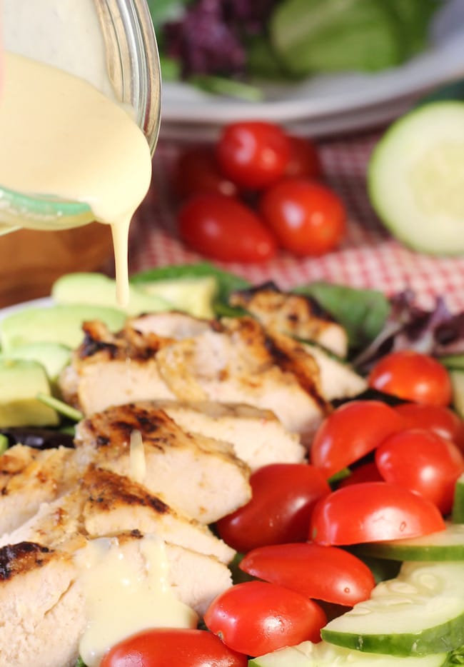 The dressing turned out so good that I decided to use it to baste the chicken as it grilled. It was a brilliant idea. The chicken turned out super moist and so flavorful.