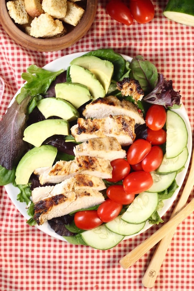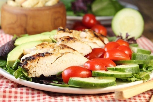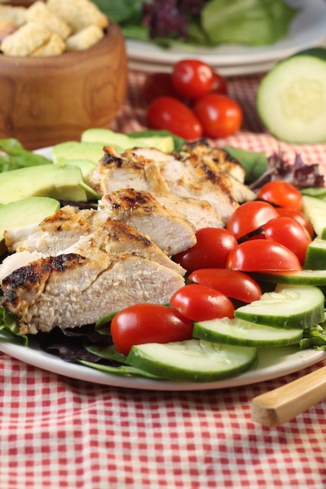 We are not the big on veggies at our house and a salad is a surefire way to get a few extra veggies on our dinner plates. Add in some tasty grilled chicken and even my picky eaters are standing in line for dinner.