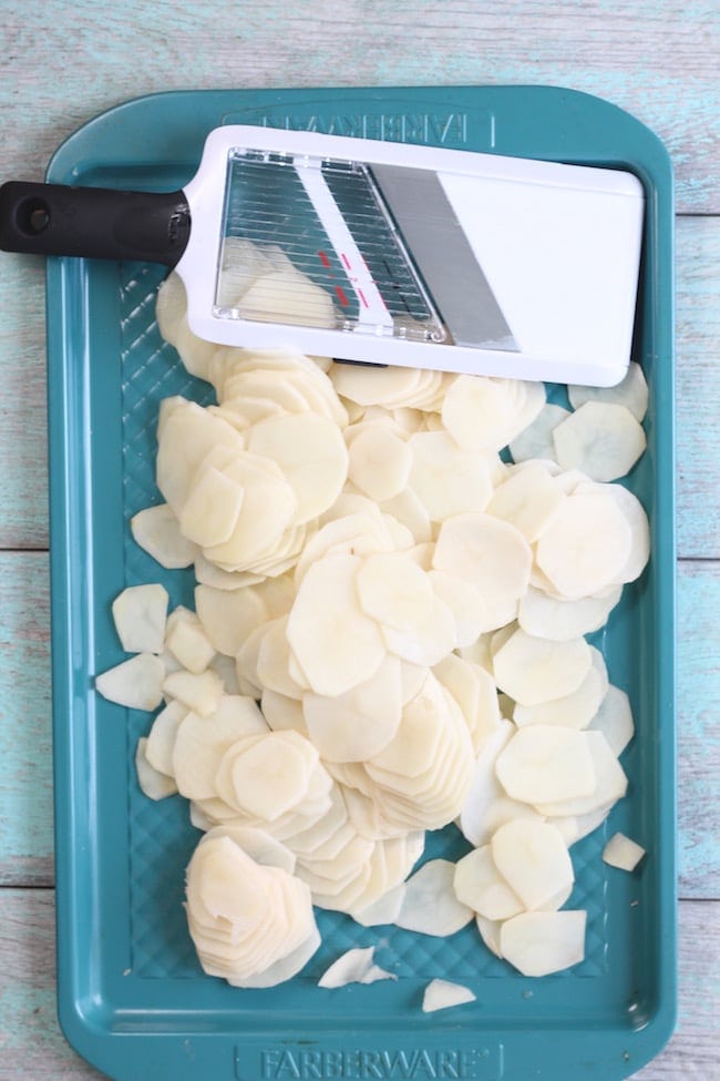 Slice potatoes thinly and chop ham into bite- size pieces. The thinner the potatoes are sliced, the quicker your casserole will cook. I absolutely love my hand held mandolin for slicing potatoes. Just be careful, it is so easy to slice your fingers right off!