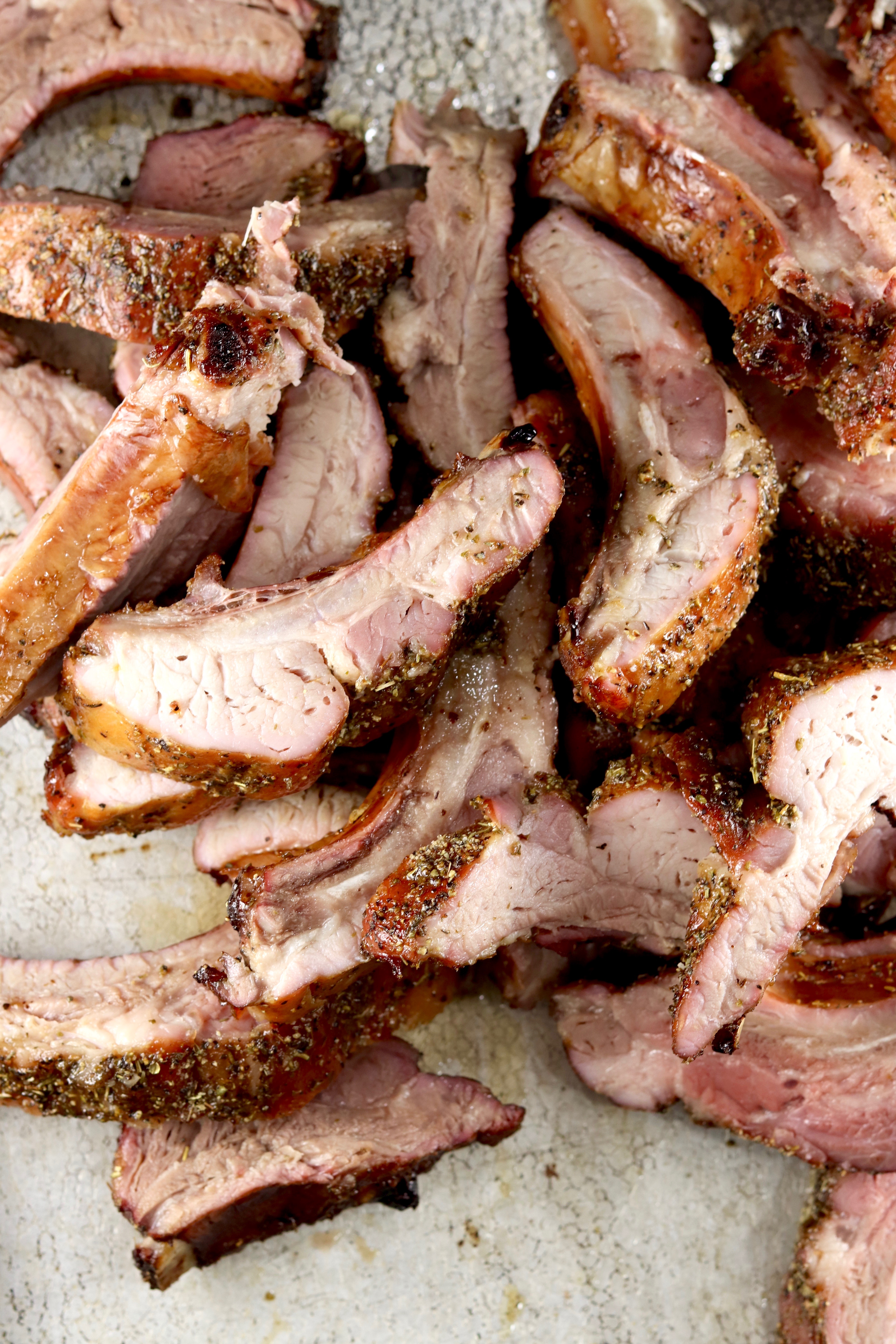 - Sprinkle about 2/3 of rub over both sides of ribs, heavier on the meaty sides.