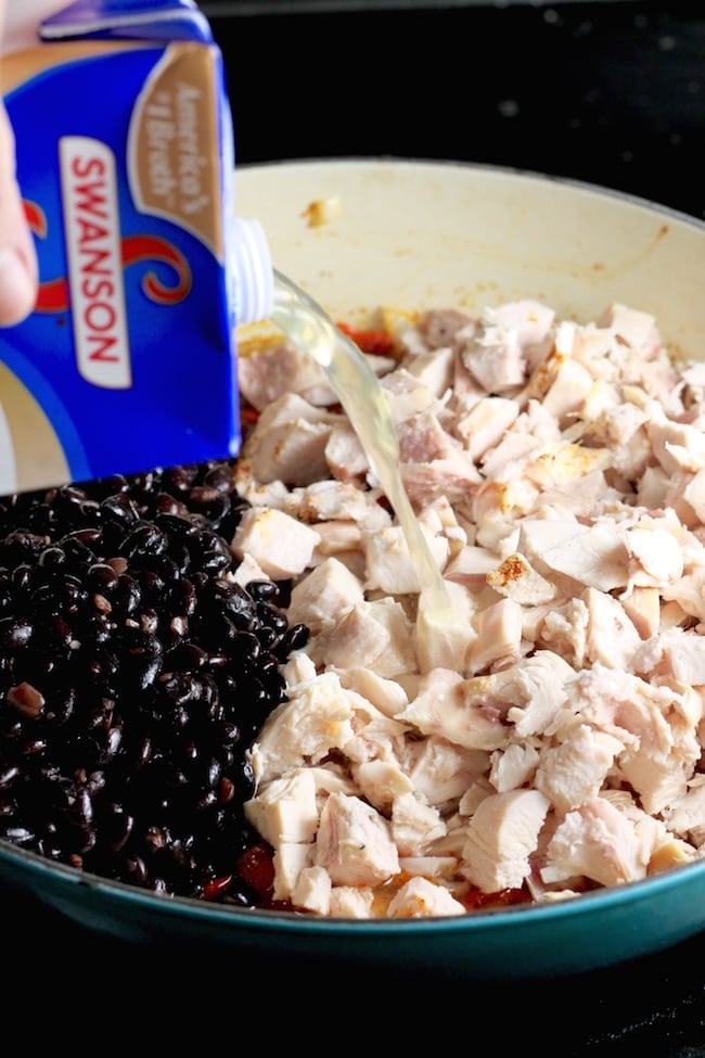 - Add chicken, beans and chicken broth. Cook on medium heat for 10 minutes.