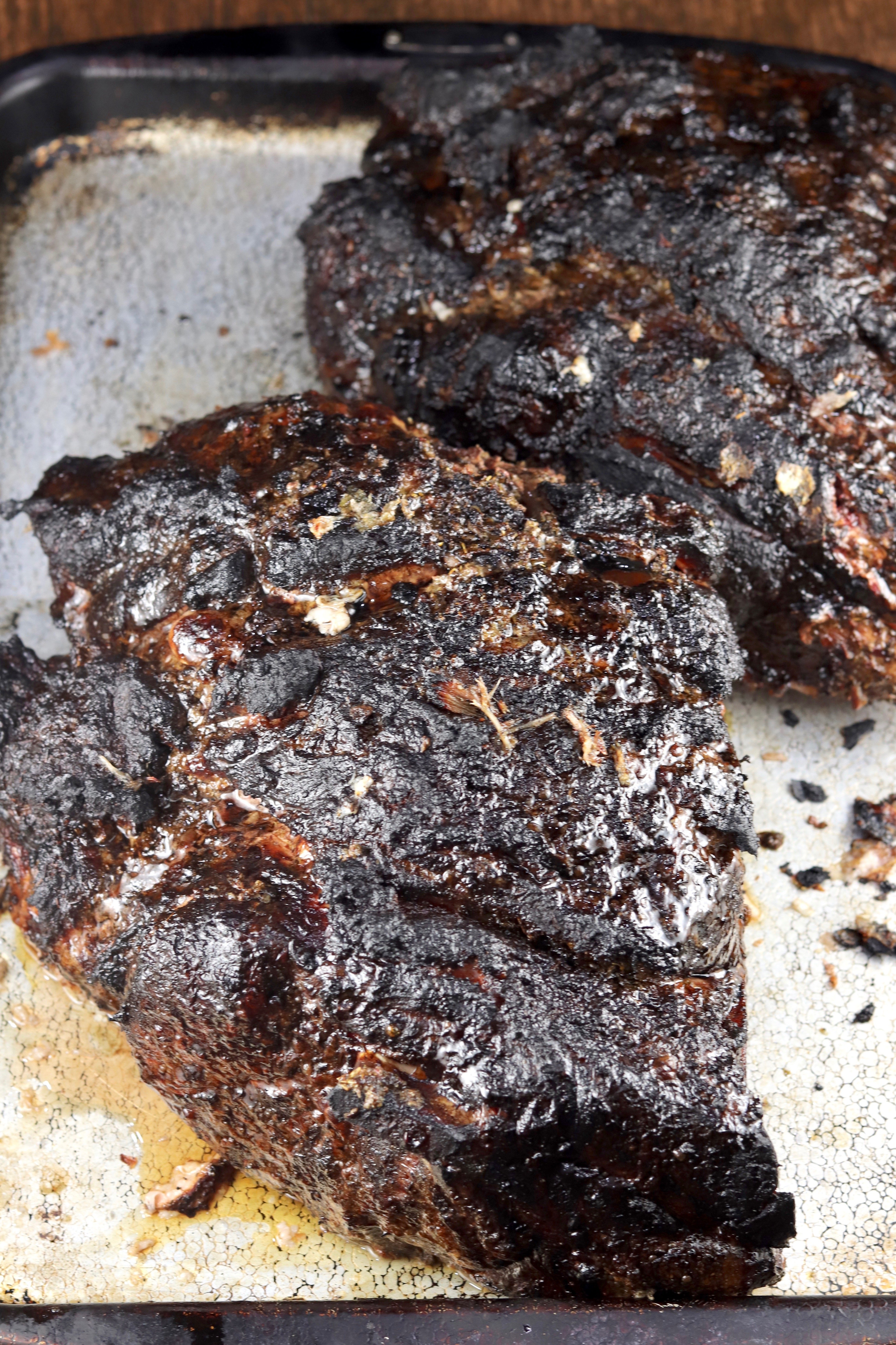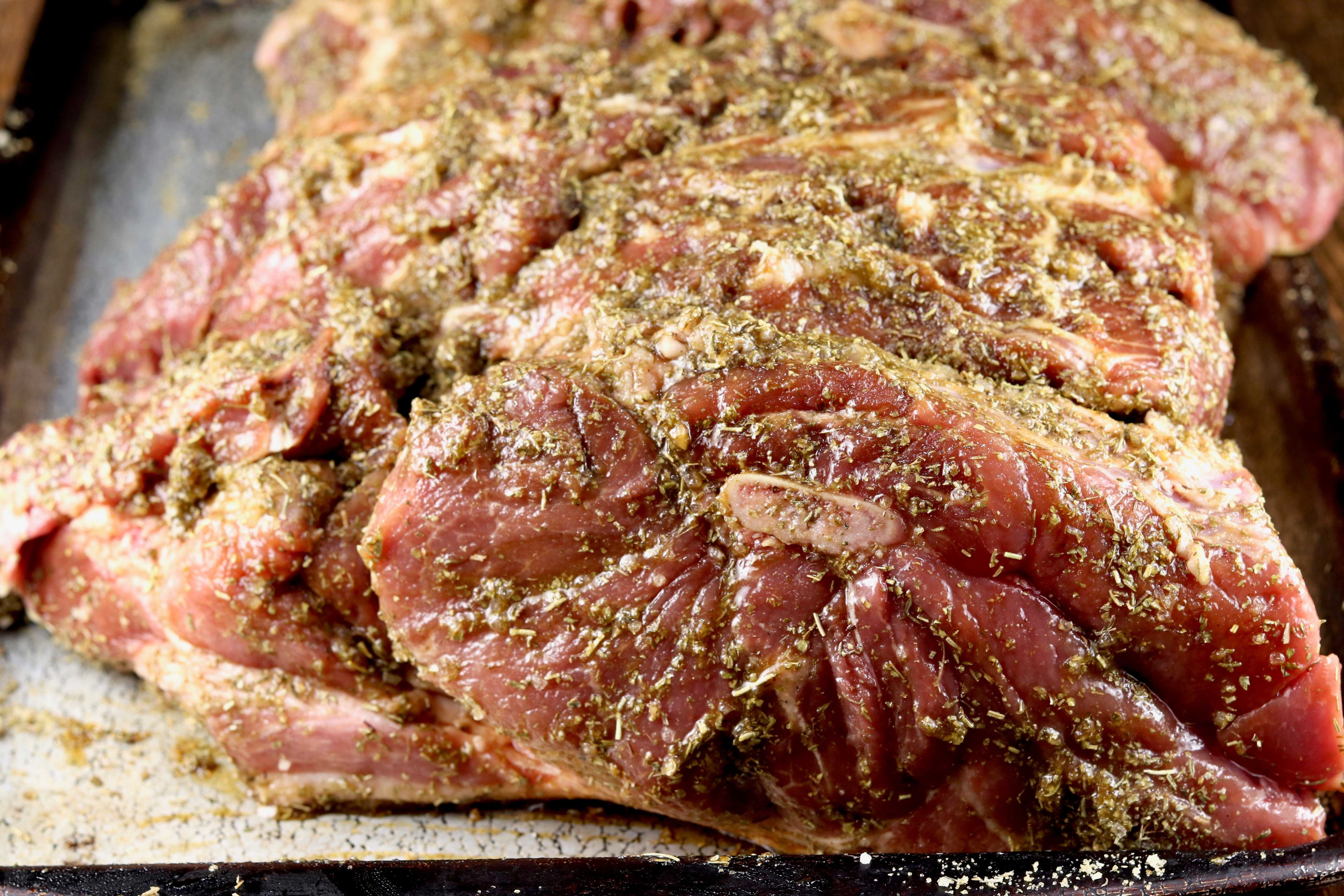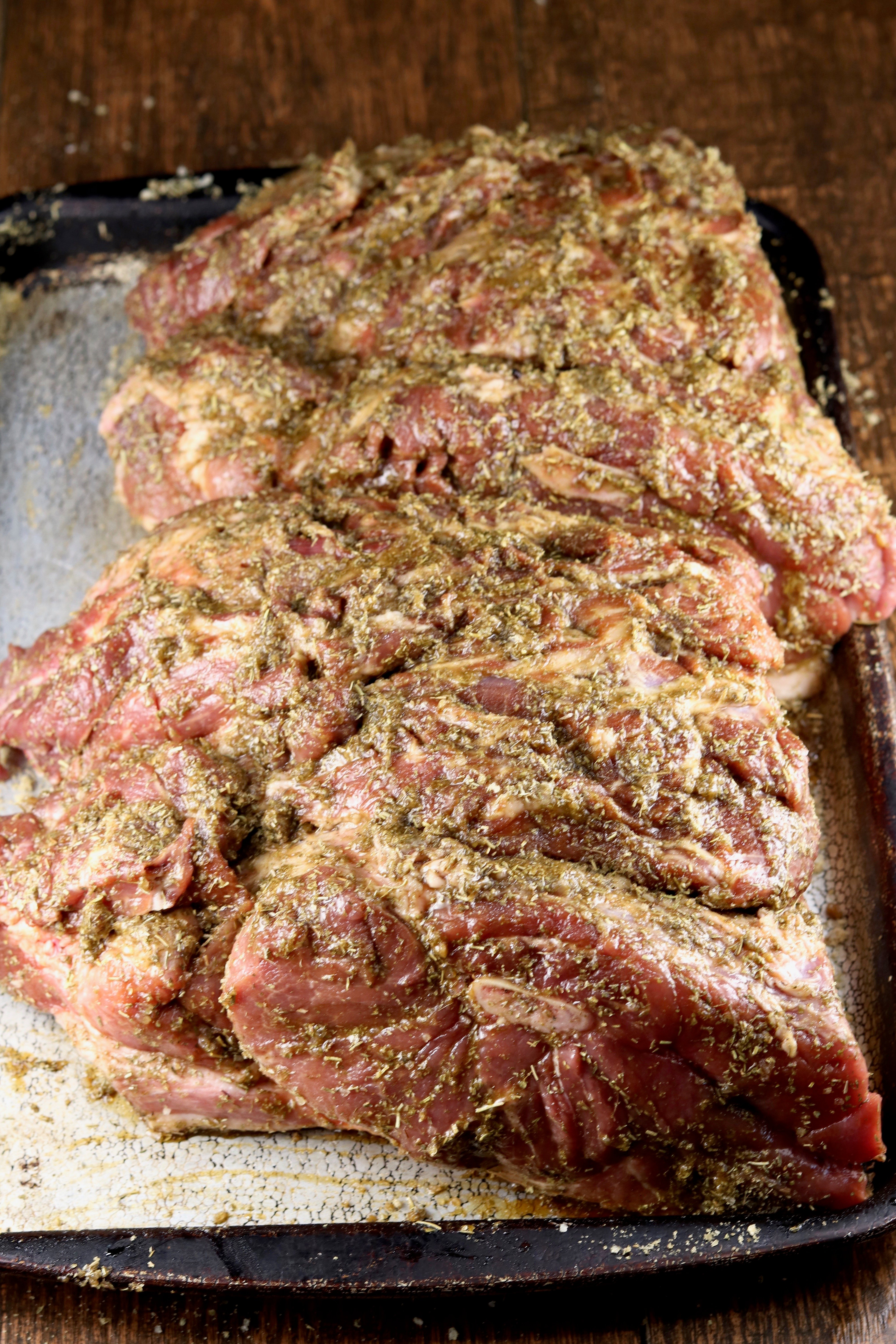 - Sprinkle half of Italian Rub over each pork butt, over all sides and down into knife cuts.