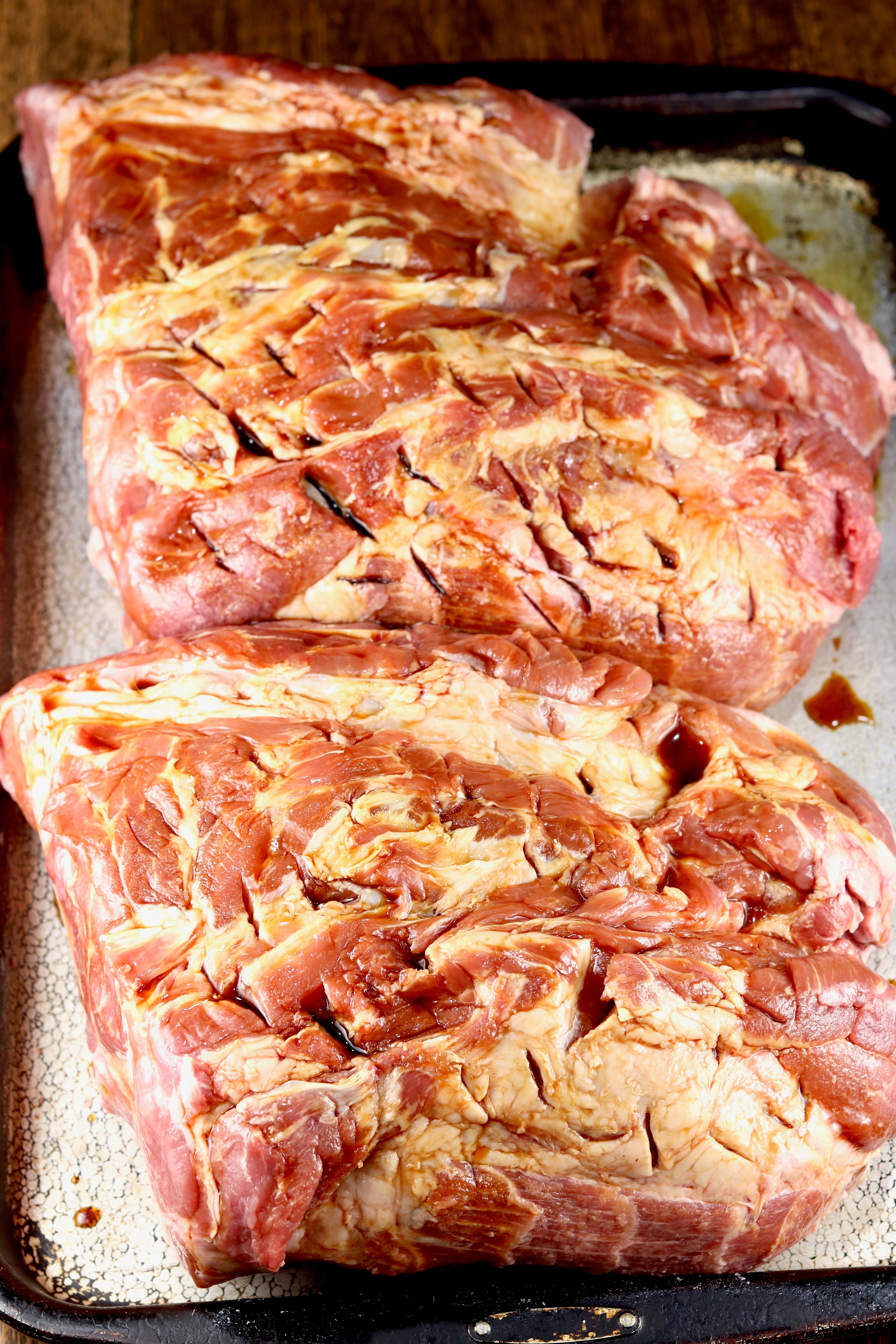 - Pour half of soy sauce over each pork butt and rub it down into the meat.