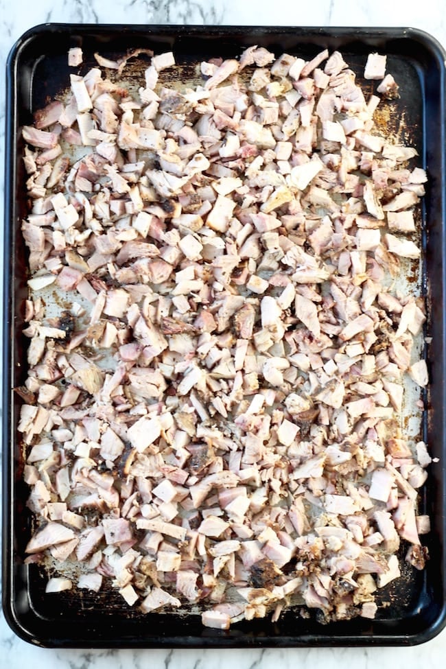 - Shred or chop two pounds of smoked pork butt and spread onto a baking sheet.