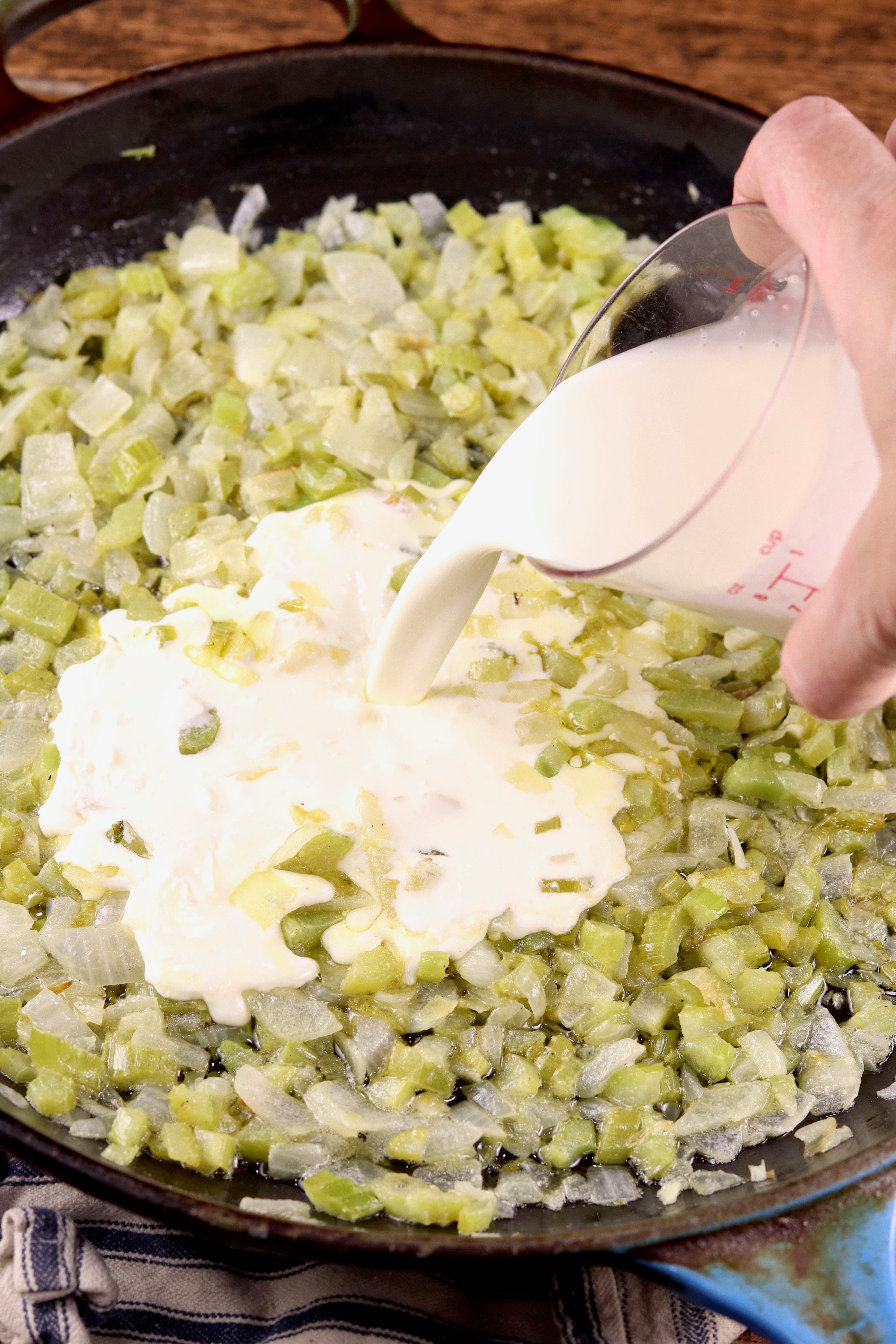 - Place a large skillet over medium- low heat. Add butter with diced onion, celery and garlic. Cook over until vegetables are softened, about 15 minutes. Stir in heavy cream, stirring just until cream starts to bubble. Remove from heat and set aside.