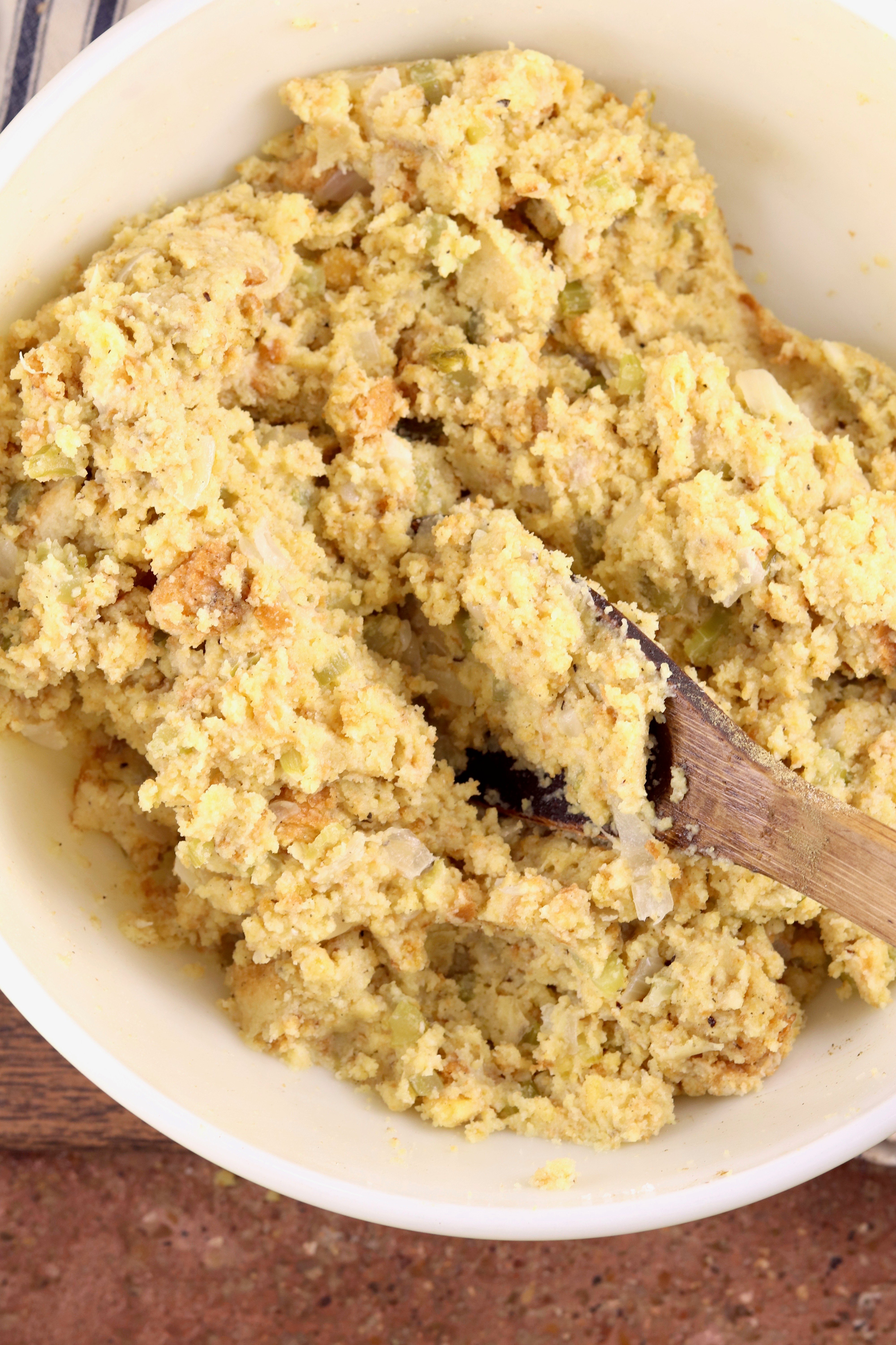 - Add the broth mixture to cornbread mixture and stir until well combined. Add an additional 1/2 cup of chicken broth if the mixture is dry. Stir in seasonings.
