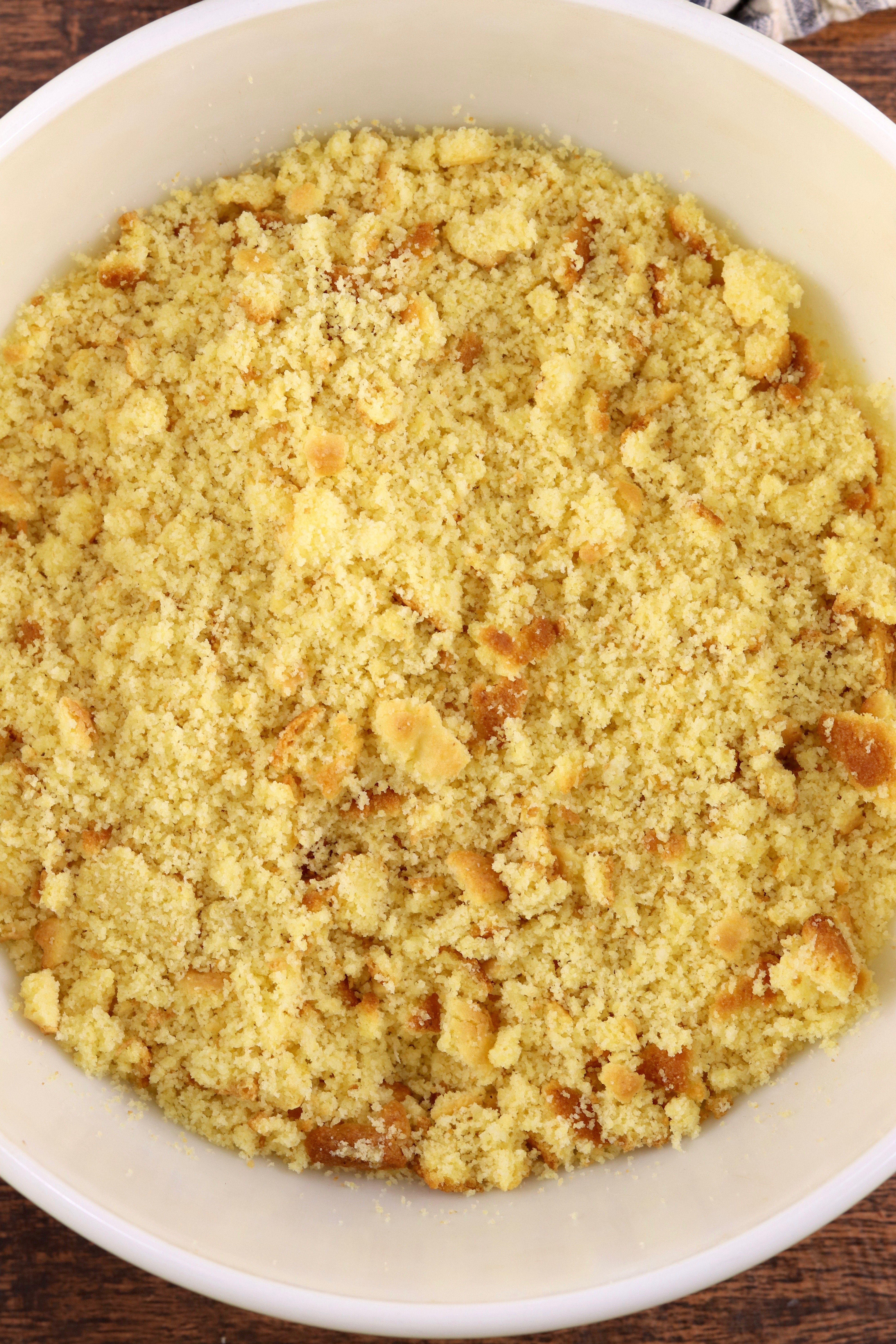 - Crumble cornbread into a large bowl and add toast.