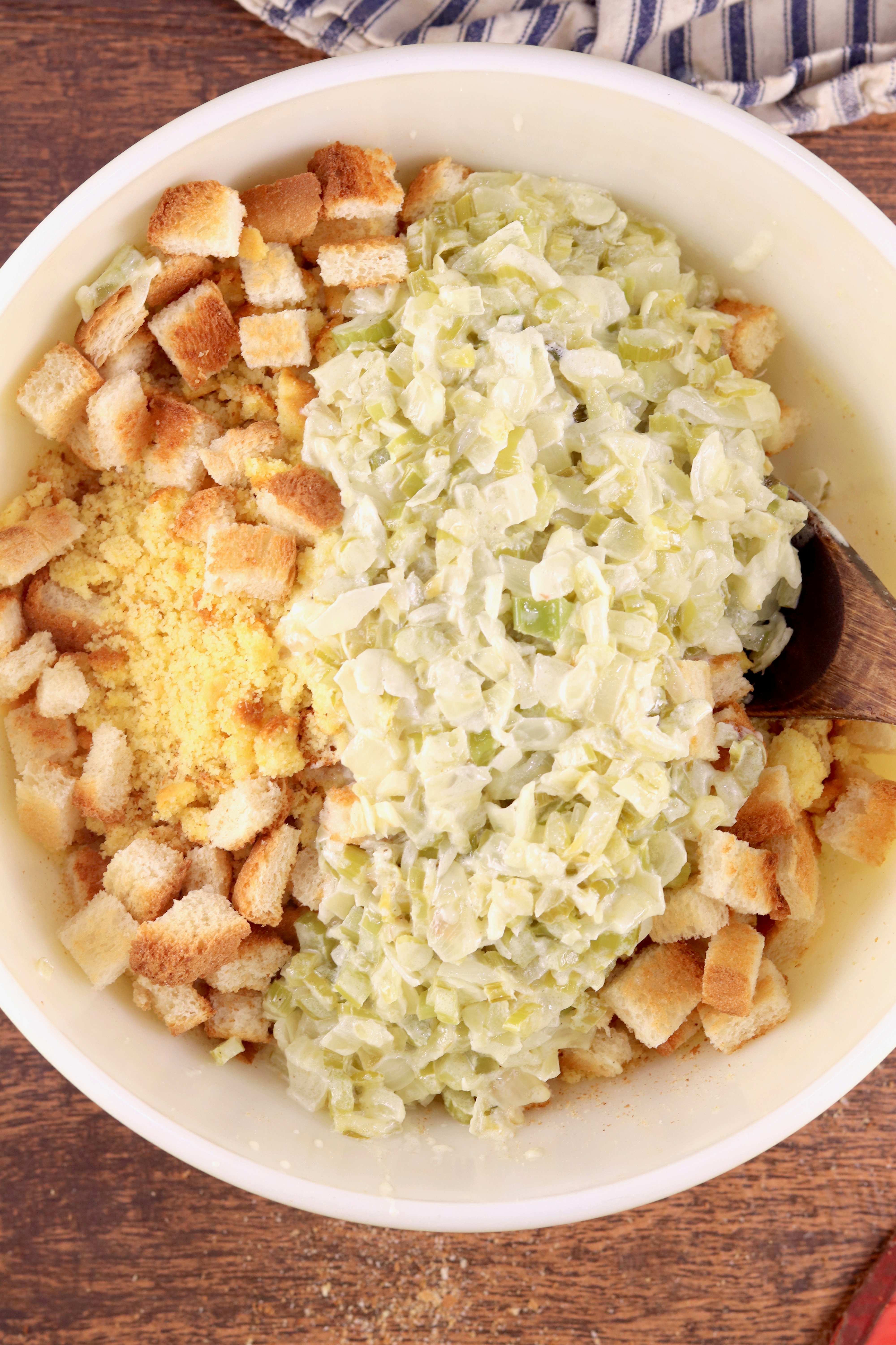 - In a large bowl, crumble cornbread completely. Add toast and vegetable and cream mixture.