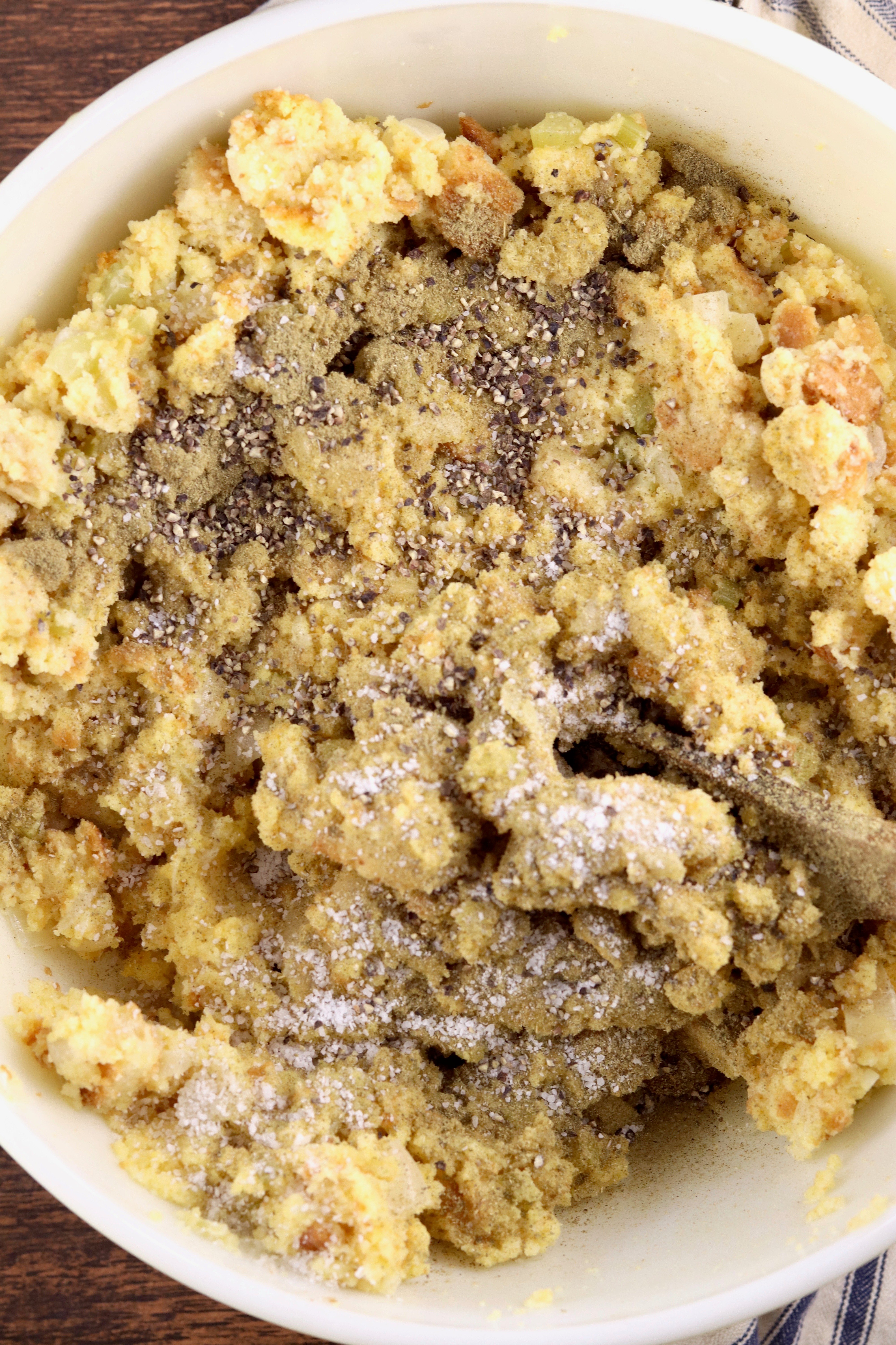 - Add to cornbread mixture and stir until well combined. Add an additional 1/2 cup of chicken broth if the mixture is dry. Stir in seasonings.