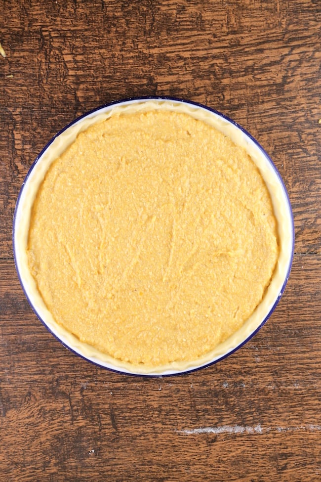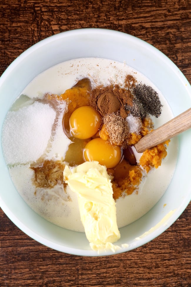 - Add softened butter, heavy cream, an egg, sugar, cinnamon, nutmeg, salt and a bit of fine ground pepper.