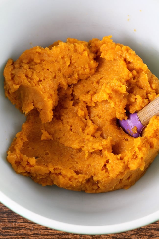- Add smashed sweet potatoes to a mixing bowl. Add softened butter, sugar, eggs, cream, vanilla, cinnamon, nutmeg, pepper and salt.