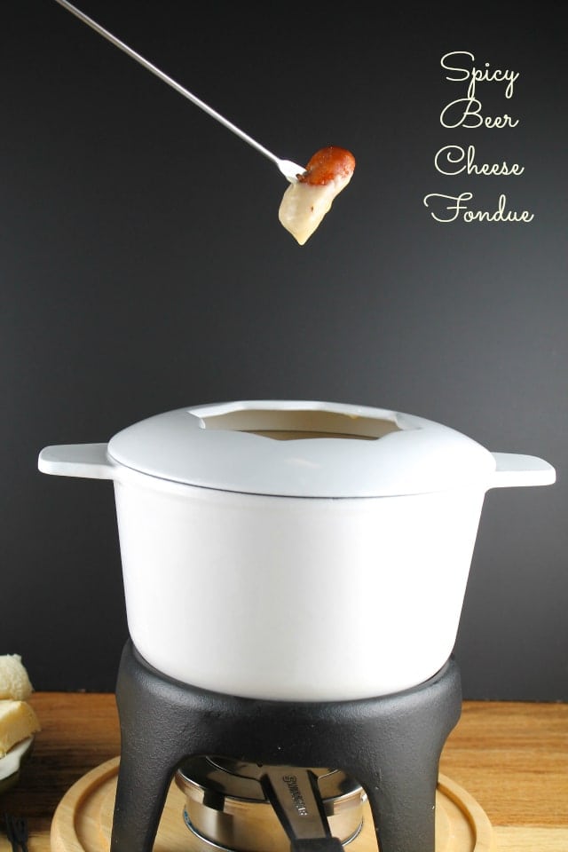 This year we will definitely be including fondue on the Super Bowl party menu. Football watching demands guy food and maybe you don’t necessarily think fondue is guy food, but it is when it’s Spicy Beer-Cheese Fondue!