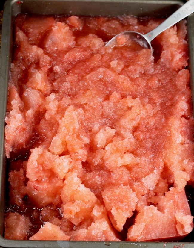 - Pour into a cake pan and place in the freezer for at least 4 hours or until frozen to slushie consistency.