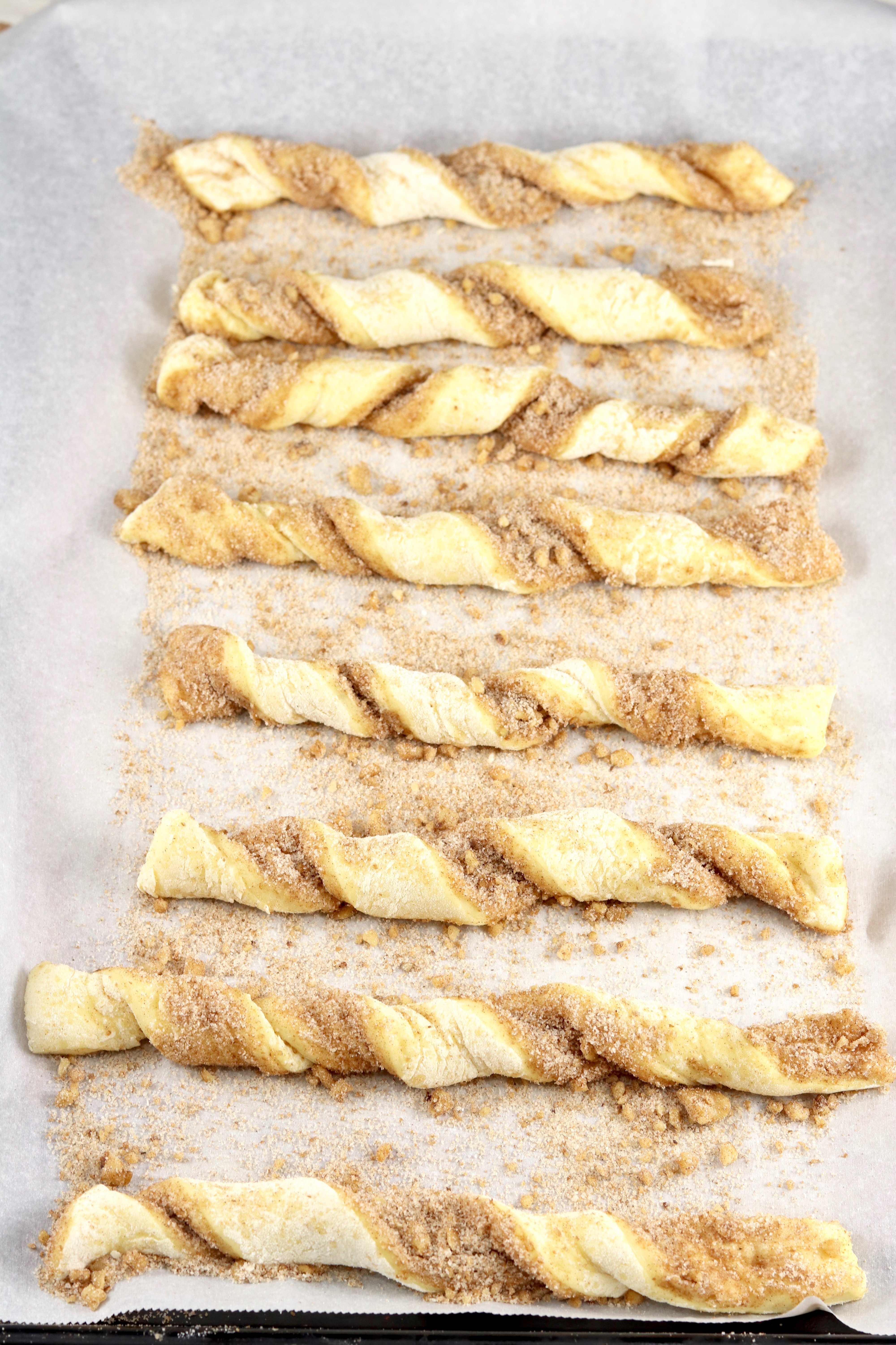 - Sprinkle any leftover cinnamon- sugar mixture over twists.