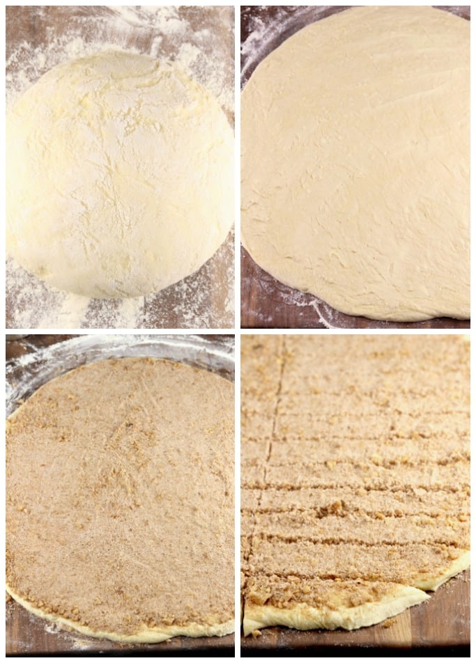 - Spread softened butter very thinly over dough. Sprinkle cinnamon, sugar and walnut mixture over dough.