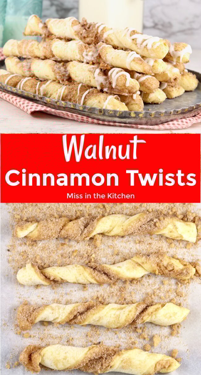 Walnut Cinnamon Twists are a delicious treat to serve for breakfast or dessert. All the flavors of a cinnamon roll in a light and fluffy bread twist with crunchy walnuts and a sweet drizzle of icing.