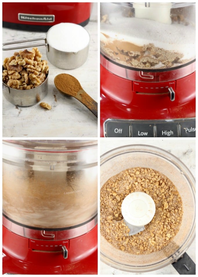 - In the meanwhile, add sugar, walnuts and cinnamon to a food processor, chopping until walnuts are finely chopped. Set aside.