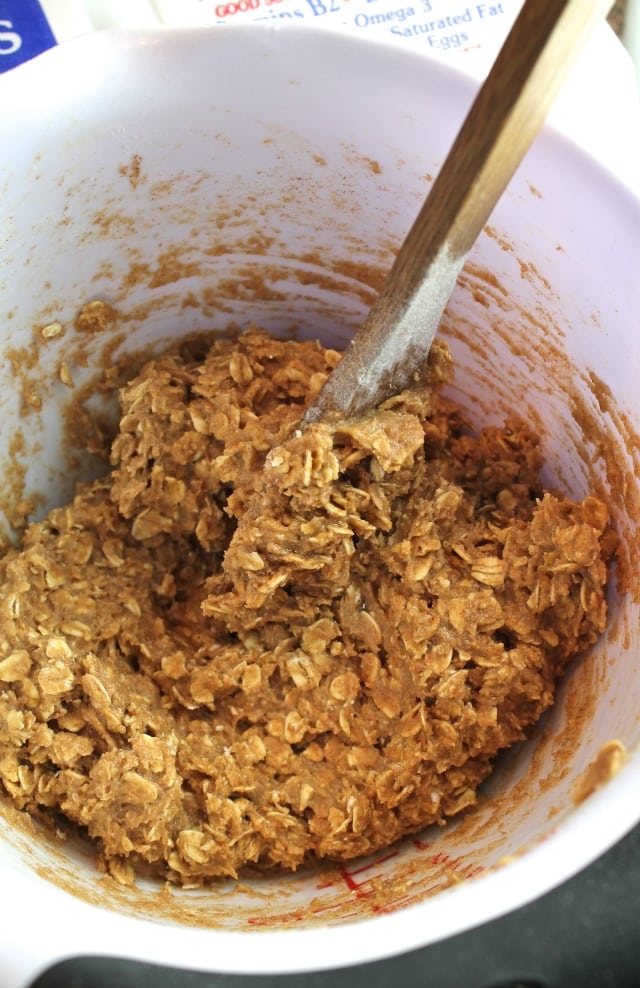 - Mix butter, eggs and brown sugar together until well combined. These cookies are easy to mix with a wooden spoon or use an electric mixer if you prefer.